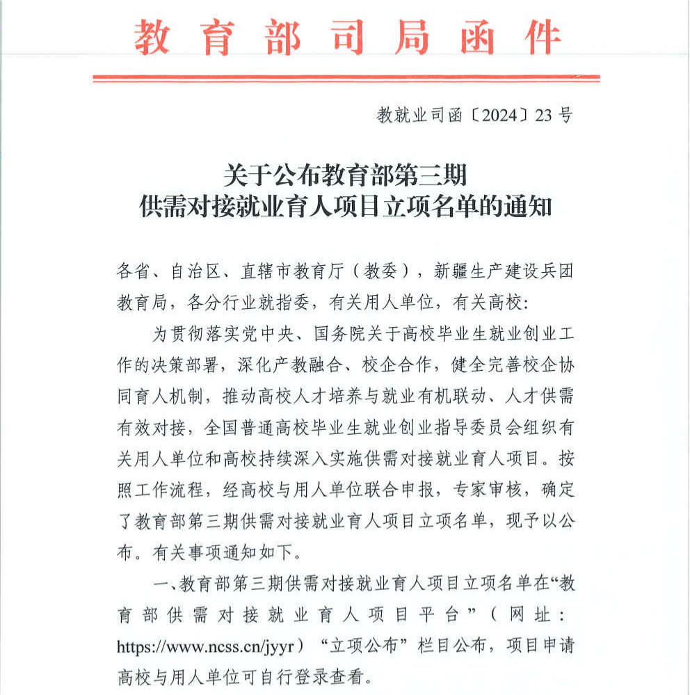 供需對接就業(yè)育人項目是教育部貫徹落實(shí)黨中央、國務(wù)院“穩(wěn)就業(yè)”“保就業(yè)”決策部署的舉措之一,旨在深化產(chǎn)教融合、校企合作,推動人才培養(yǎng)與就業(yè)有機(jī)聯(lián)動、人才供需有效對接的有效途徑。供需對接就業(yè)育人項目由高校和用人單位共同申報,經(jīng)教育部組織專家審核立項。用人單位提供項目專項經(jīng)費(fèi)和資源支持,通過與高校開展定向人才培養(yǎng)、就業(yè)實(shí)習(xí)等合作,培養(yǎng)更多高素質(zhì)技術(shù)技能型人才。