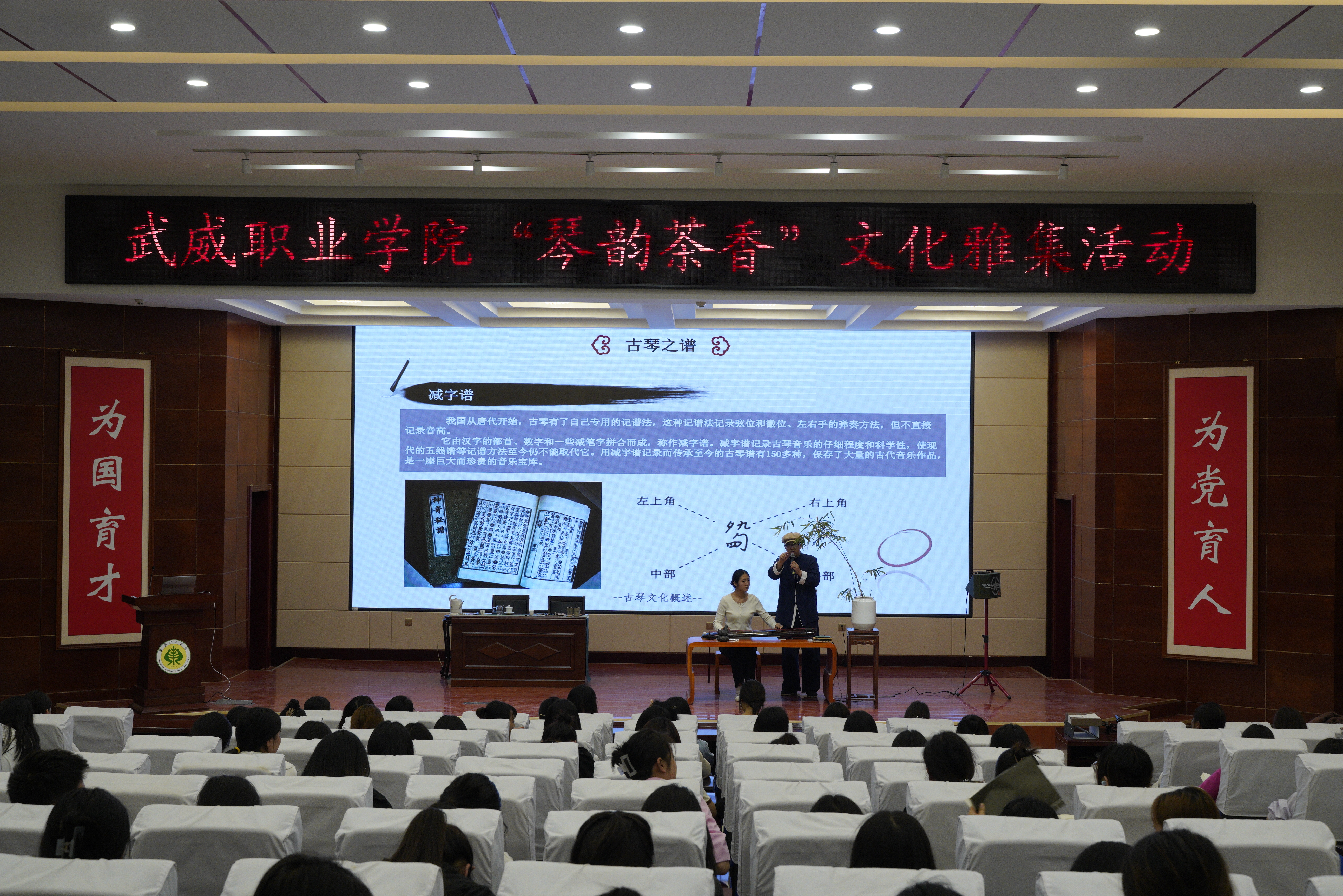 自古以來,文人雅士都曉韻律,善七弦,諳茶道。古琴和茶藝承載著豐富的歷史和文化內(nèi)涵,是中國傳統(tǒng)文化的重要代表之一。為了使學(xué)生可以更好地了解和傳承中華傳統(tǒng)文化的精髓和特點,推動傳統(tǒng)文化發(fā)展創(chuàng)新,近日,傳統(tǒng)文化體驗中心邀請到武威古琴協(xié)會會長霍宏昌及其團(tuán)隊,在學(xué)校菁英廳開展“琴韻茶香”文化雅集活動。