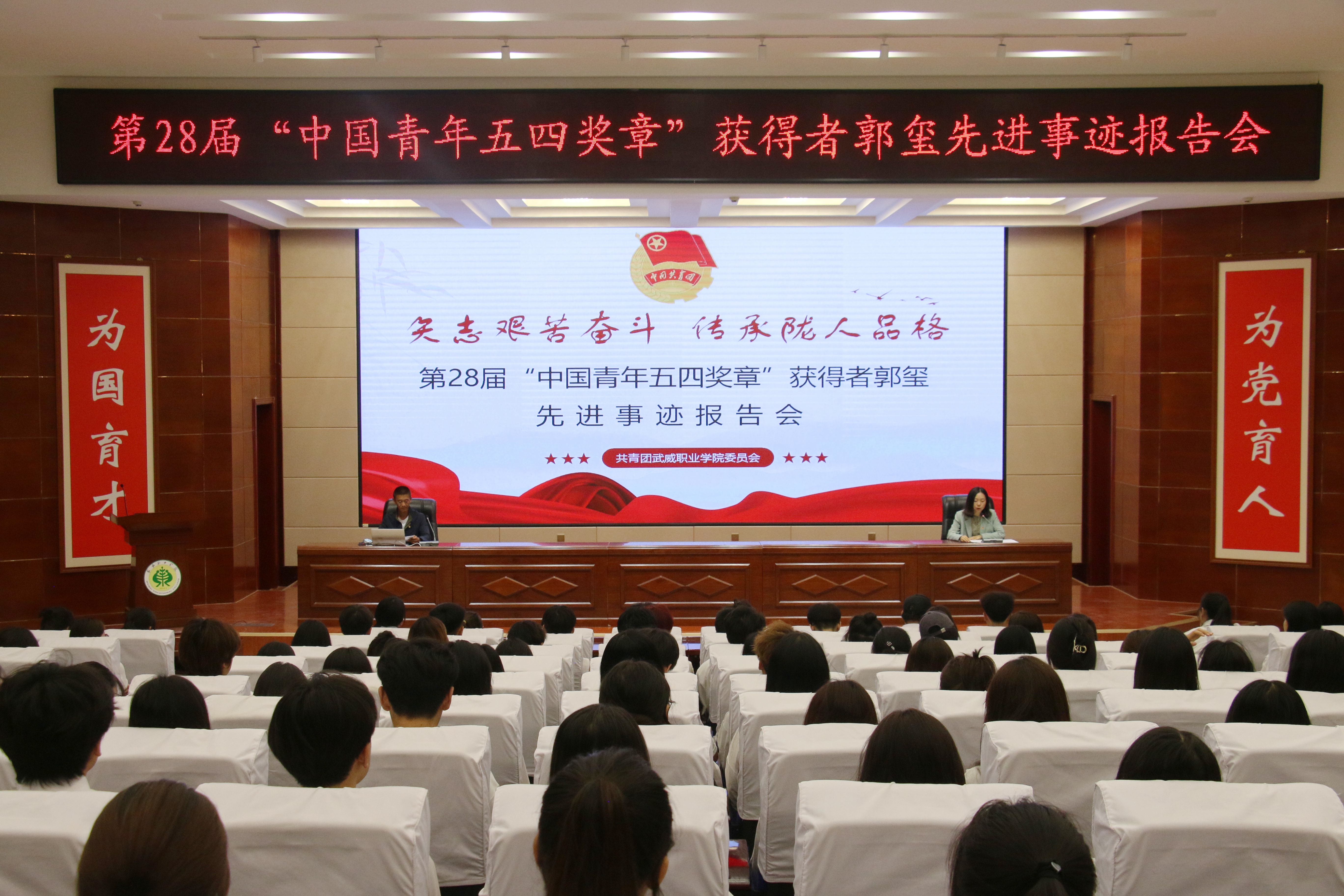為進一步引導和激勵團員青年踔厲奮發(fā)、篤行不怠,厚植奮斗底色,5月24日,學校在菁英廳舉行“矢志艱苦奮斗傳承隴人品格”第28屆“中國青年五四獎章”個人先進事跡報告會。學校邀請第28屆“中國青年五四獎章”獲得者——郭璽同志出席活動,并作了“三代青春鑄綠洲”主題宣講報告。學?!扒囫R工程”培訓班學員、優(yōu)秀學生代表共計220余人參加報告會。會議由團委副書記謝麗霞主持。