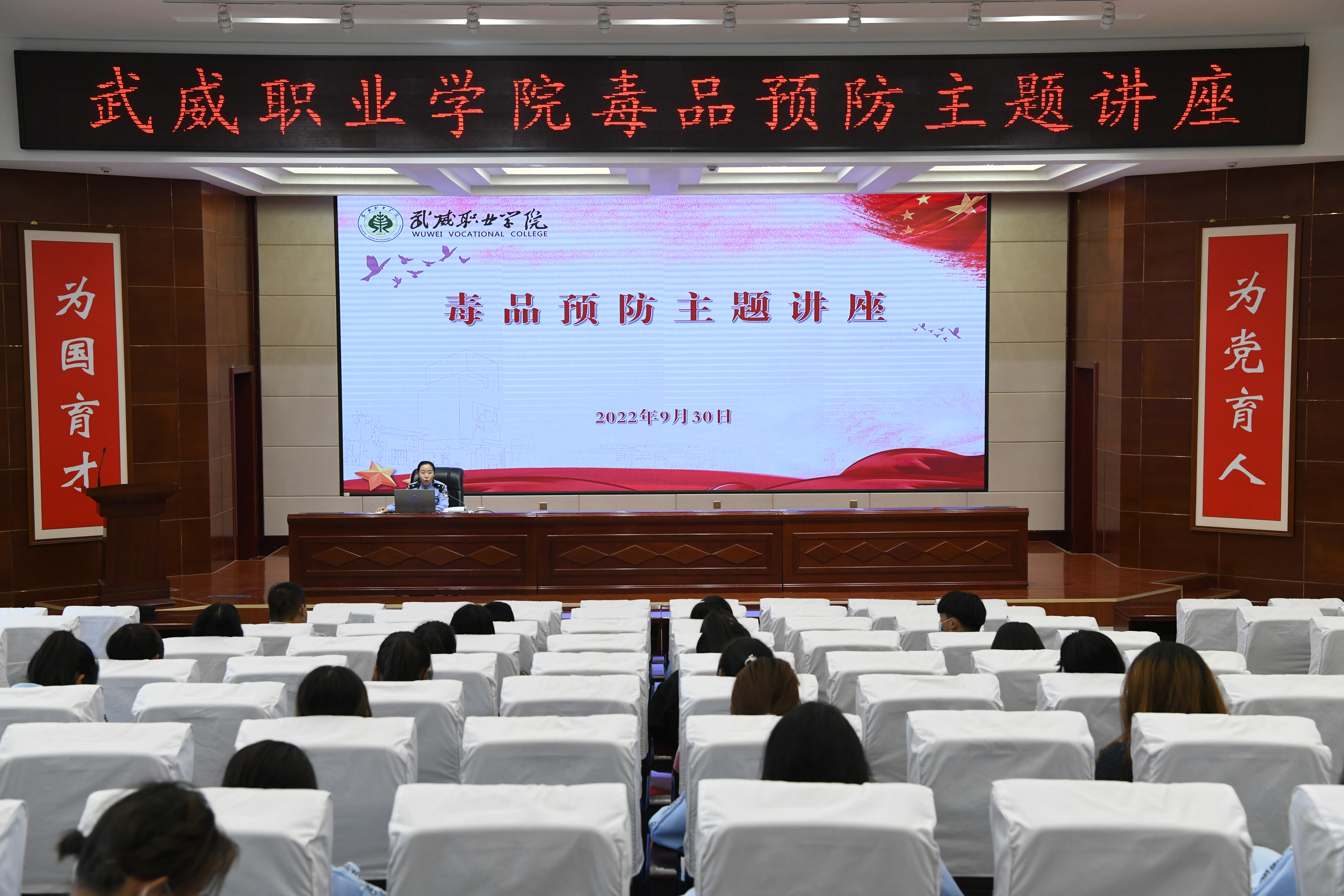 為進(jìn)一步加強(qiáng)學(xué)校毒品預(yù)防教育工作,不斷提高師生識(shí)毒、防毒、拒毒意識(shí),9月30日,學(xué)校安全保衛(wèi)處邀請(qǐng)武威市公安局涼州分局西關(guān)派出所民警王敏同志在學(xué)生發(fā)展中心菁英廳開展“健康人生 綠色無(wú)毒”預(yù)防毒品主題講座,各二級(jí)學(xué)院師生代表聆聽(tīng)了講座,講座由安全保衛(wèi)處負(fù)責(zé)人李欣主持。