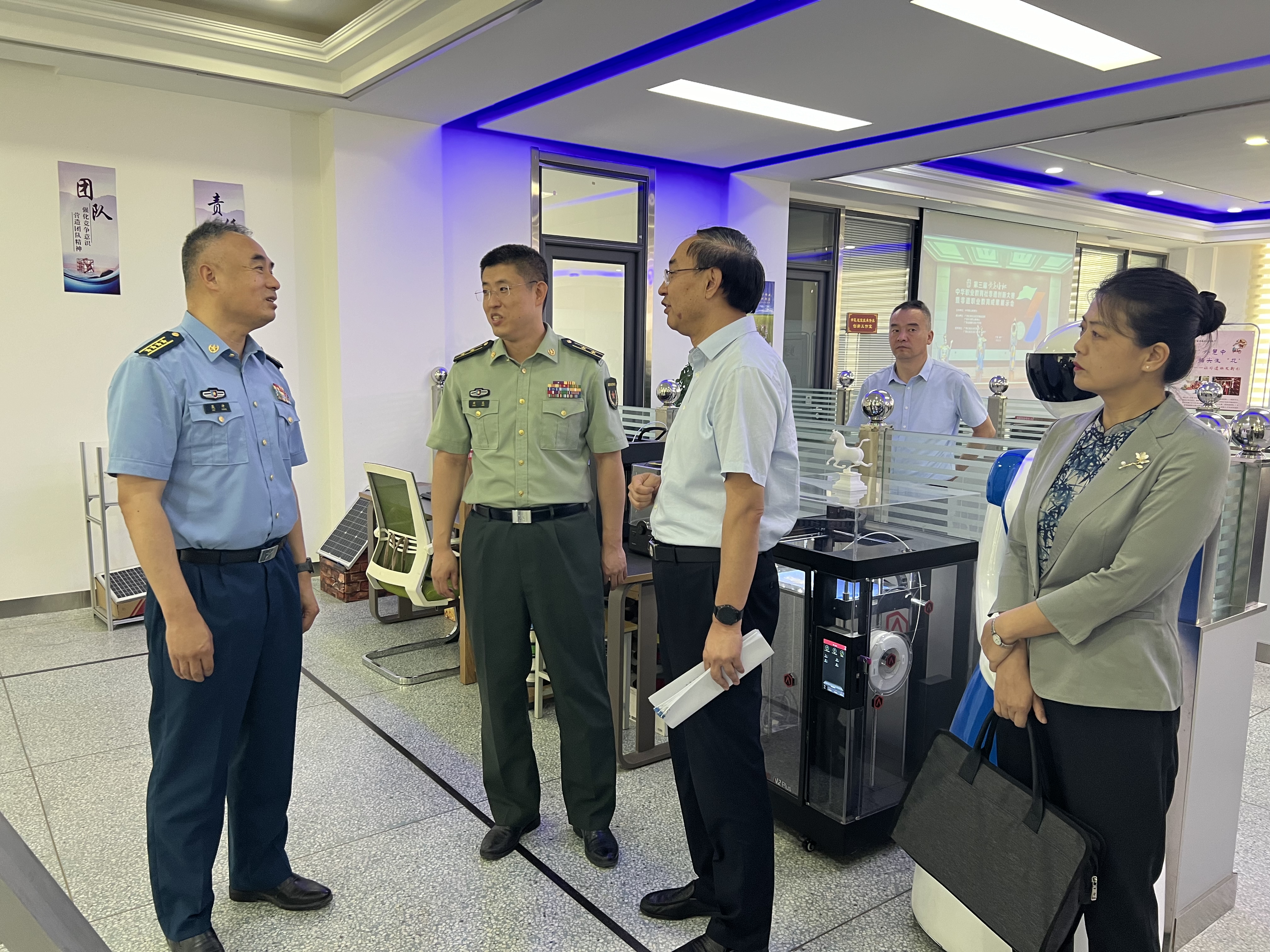 工作組一行參觀了學(xué)校征兵工作站,查看了近年來征兵工作相關(guān)資料,并參觀了學(xué)校創(chuàng)新創(chuàng)業(yè)學(xué)院、體育場和工程技術(shù)學(xué)院智能制造實訓(xùn)中心。參觀結(jié)束后,在學(xué)校能源樓一樓會議室向工作組匯報了學(xué)校貫徹落實《兵役法》的具體措施,取得的成效以及下一步打算。工作組對學(xué)校黨委領(lǐng)導(dǎo)重視貫徹落實《兵役法》和征兵工作給予高度肯定!對學(xué)校近兩年超額完成征兵任務(wù)表示衷心感謝!希望學(xué)校繼續(xù)做好兵役征集工作,為部隊輸送高質(zhì)量的優(yōu)秀兵源。