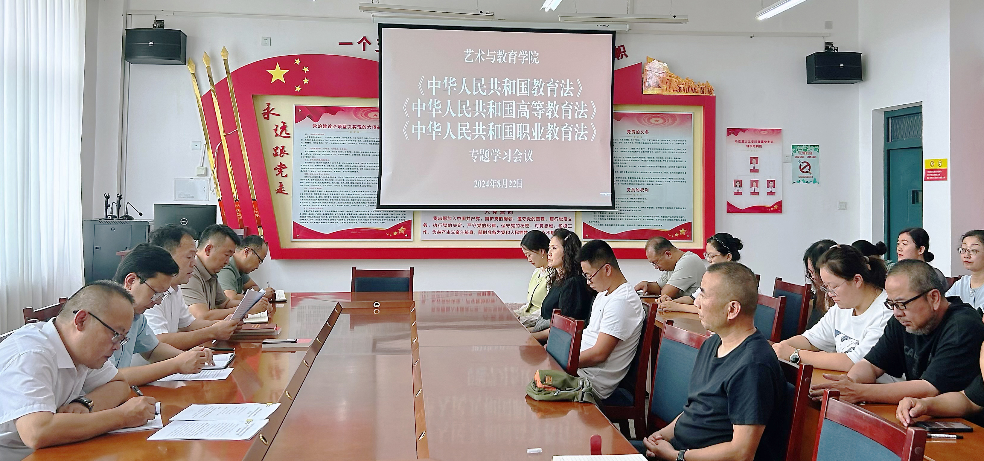 為進(jìn)一步提高教師的法律法規(guī)意識,加強(qiáng)教師的師德師風(fēng)建設(shè),轉(zhuǎn)變觀念、解放思想,樹立現(xiàn)代職業(yè)教育觀念,扎實(shí)推動教育教學(xué)工作高質(zhì)量發(fā)展,8月22日下午,藝術(shù)與教育學(xué)院組織全體教職工專題學(xué)習(xí)《中華人民共和國教育法》《中華人民共和國高等教育法》《中華人民共和國職業(yè)教育法》等教育相關(guān)法律法規(guī)及政策文件。會議由黨總支書記王政主持。