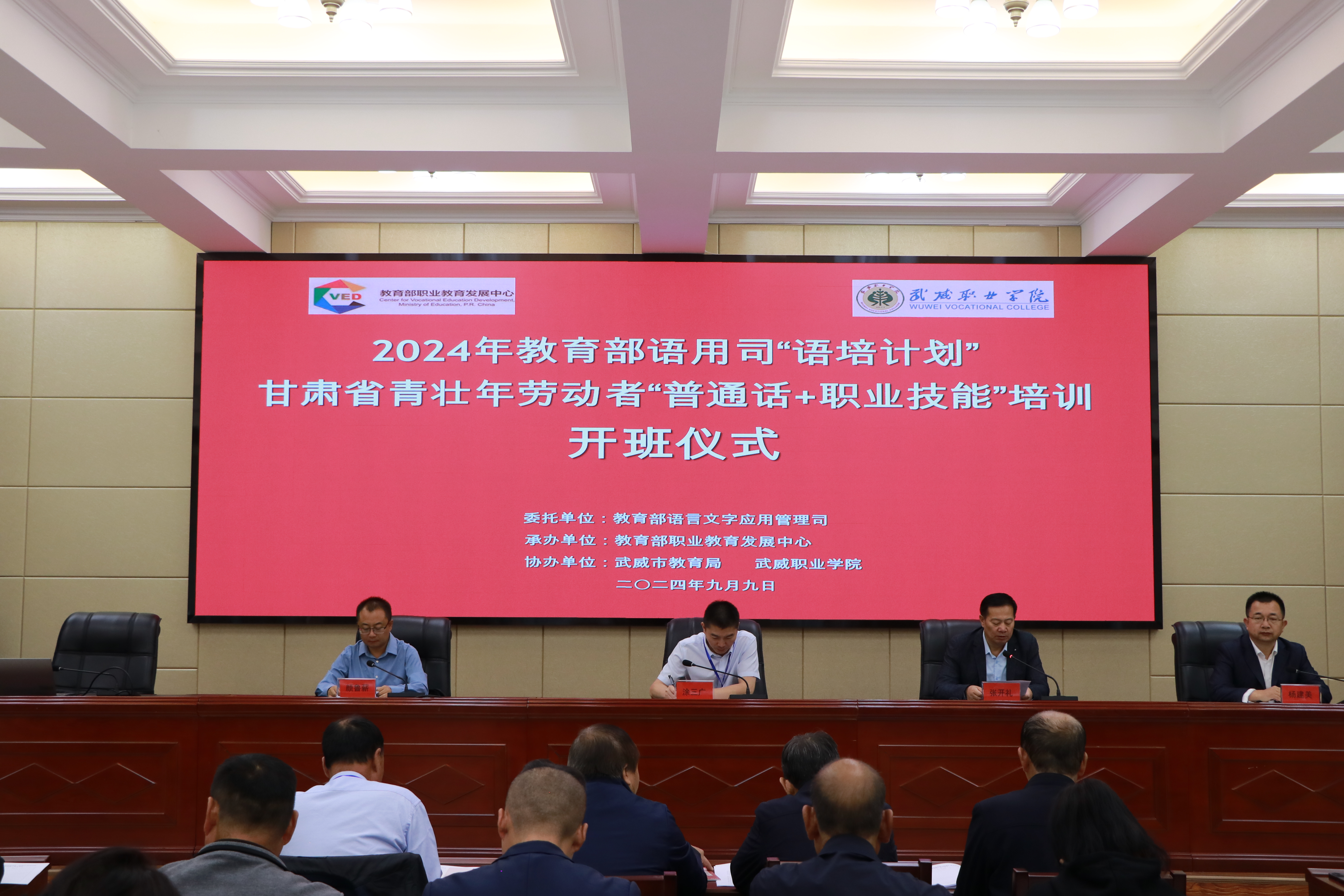 9月9日上午,2024年教育部語用司“語培計劃”甘肅省青壯年勞動者“普通話+職業(yè)技能”培訓(xùn)班在我校正式開班。本次培訓(xùn)是深入貫徹黨的二十大精神和二十屆三中全會精神,根據(jù)教育部語用司《關(guān)于實施2024年國家通用語言文字示范性培訓(xùn)計劃的通知》,受教育部語用司委托,由教育部職業(yè)教育發(fā)展中心承辦、武威市教育局、學(xué)校共同協(xié)辦。本次培訓(xùn)為期5天,共有來自武威市三縣一區(qū)的50余名學(xué)員參加。培訓(xùn)以“語言鋪路,技能致富”為主題,培訓(xùn)內(nèi)容聚焦當?shù)剞r(nóng)業(yè)種植技術(shù)技能和畜牧業(yè)養(yǎng)殖技能開展,以古浪“紅禿頭”小麥、民勤蜜瓜等特色農(nóng)產(chǎn)品的栽培養(yǎng)殖技術(shù)為主線,設(shè)計了“普通話+職業(yè)技能”為主題的課程內(nèi)容,邀請了國家級普通話測試員、甘肅省農(nóng)業(yè)科學(xué)院專家、武威市農(nóng)科所專家等組成的專家團隊。