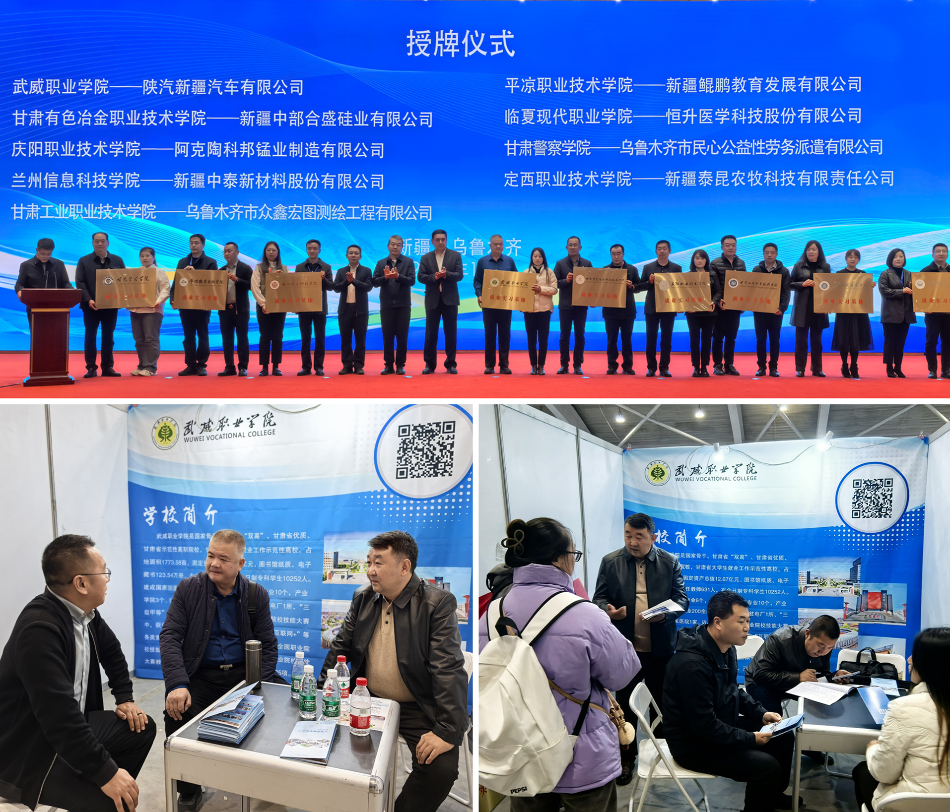 11月1日,召開了甘肅省2025屆畢業(yè)生推介會暨供需對接“政校企”合作座談會、甘青新蒙四省(區(qū))八市(州盟)“紅石榴促就業(yè)”訪企拓崗座談會,30余家企事業(yè)單位與學校就人才招聘、校企合作等方面的內(nèi)容進行了深入交流。在“政校企”合作座談會上,王守云為陜汽新疆汽車有限公司授予武威職業(yè)學院實習就業(yè)基地牌匾。