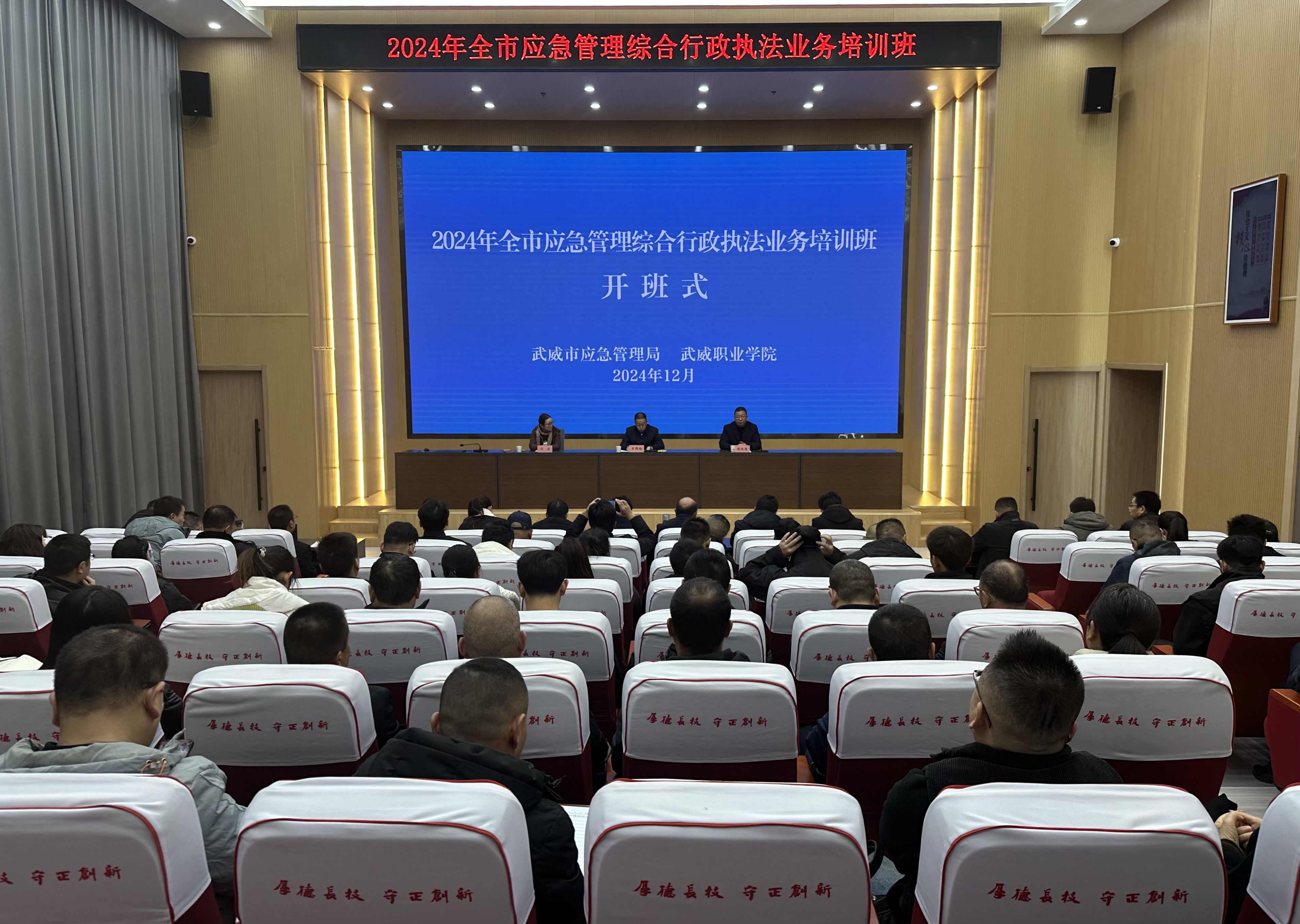 2024 年 12 月 3 日,由武威市應急管理局主辦,我校承辦的“2024 年武威市應急管理綜合行政執(zhí)法業(yè)務培訓班暨安全監(jiān)管執(zhí)法競賽比武”正式開班。武威市應急管理局黨組成員、副局長王國棟,學校黨委委員、紀委書記陳曉煜出席開班式。
