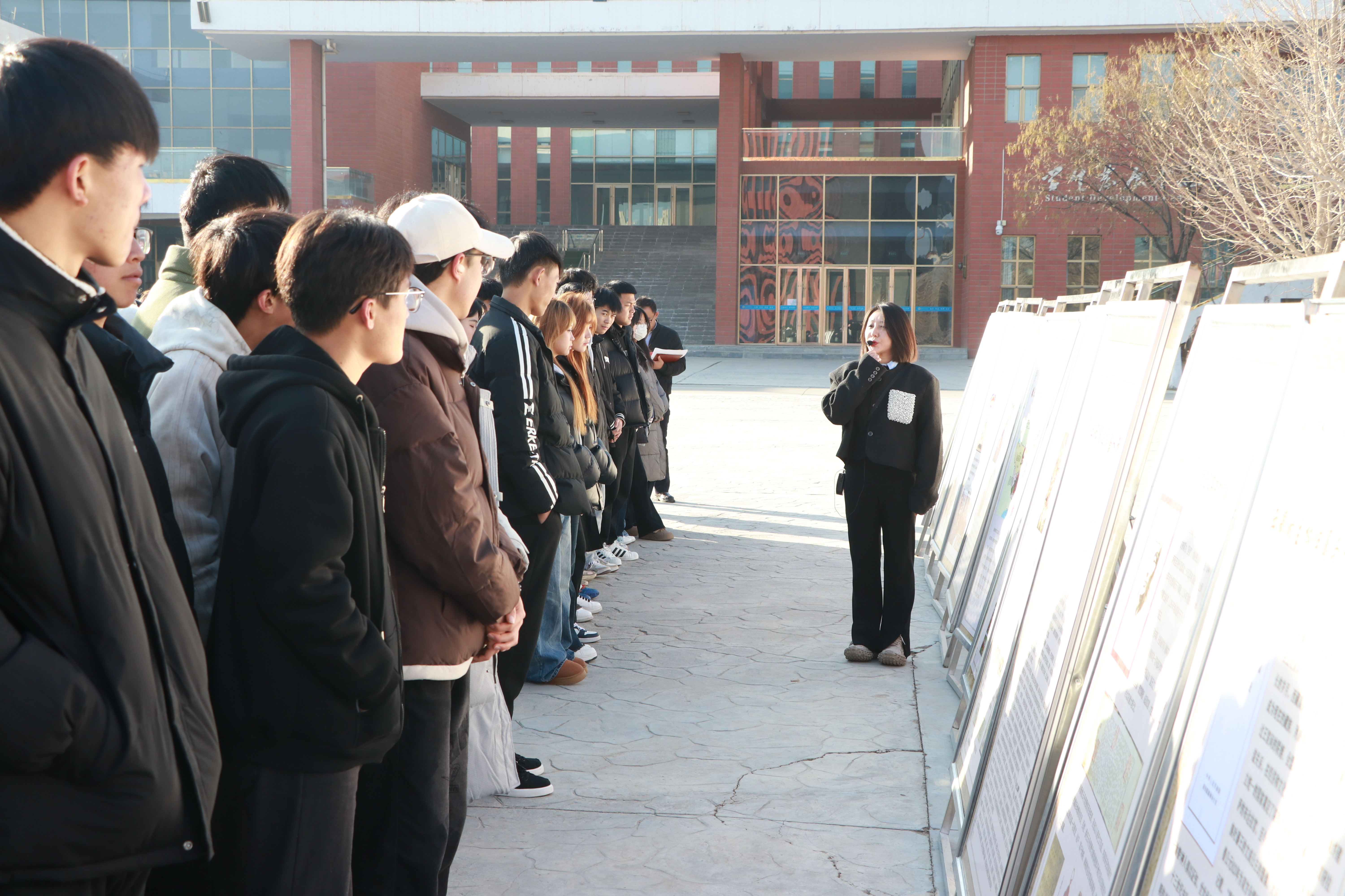 在學生發(fā)展中心前廣場,同學們現(xiàn)場參觀了民族文化宣傳展板,二十余塊展板圖文并茂生動展現(xiàn)了涼州會盟的歷史背景和意義,展示了新時代武威市在民族團結(jié)進步方面的壯闊歷程和取得的豐碩成果。武威市涼州會盟紀念館講解員楊琪以涼州會盟歷史為線,現(xiàn)場向大家講解了民族團結(jié)故事。