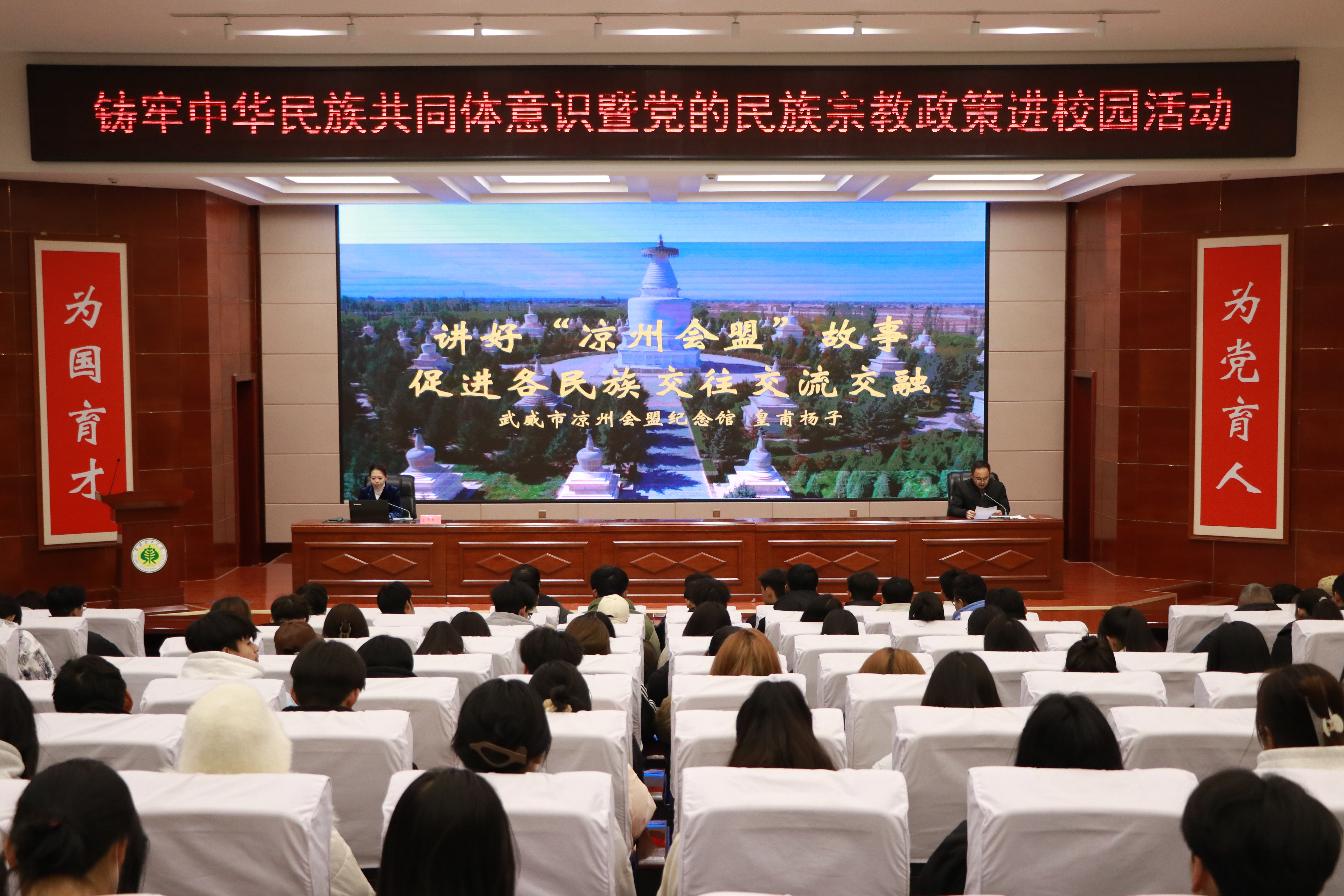 參觀活動后,武威市鑄牢中華民族共同體意識“紅石榴”宣講員皇甫楊子在學校菁英廳以《講好涼州會盟故事 促進各民族交流交融》為題開展了主題講座。她通過生動的案例和富有感染力的語言,深入剖析涼州會盟的歷史背景、文化意義以及對當代民族團結(jié)的啟示,引導同學們深刻感知中華民族多元一體格局的優(yōu)越性,增強對中華民族大家庭的認同感和歸屬感。