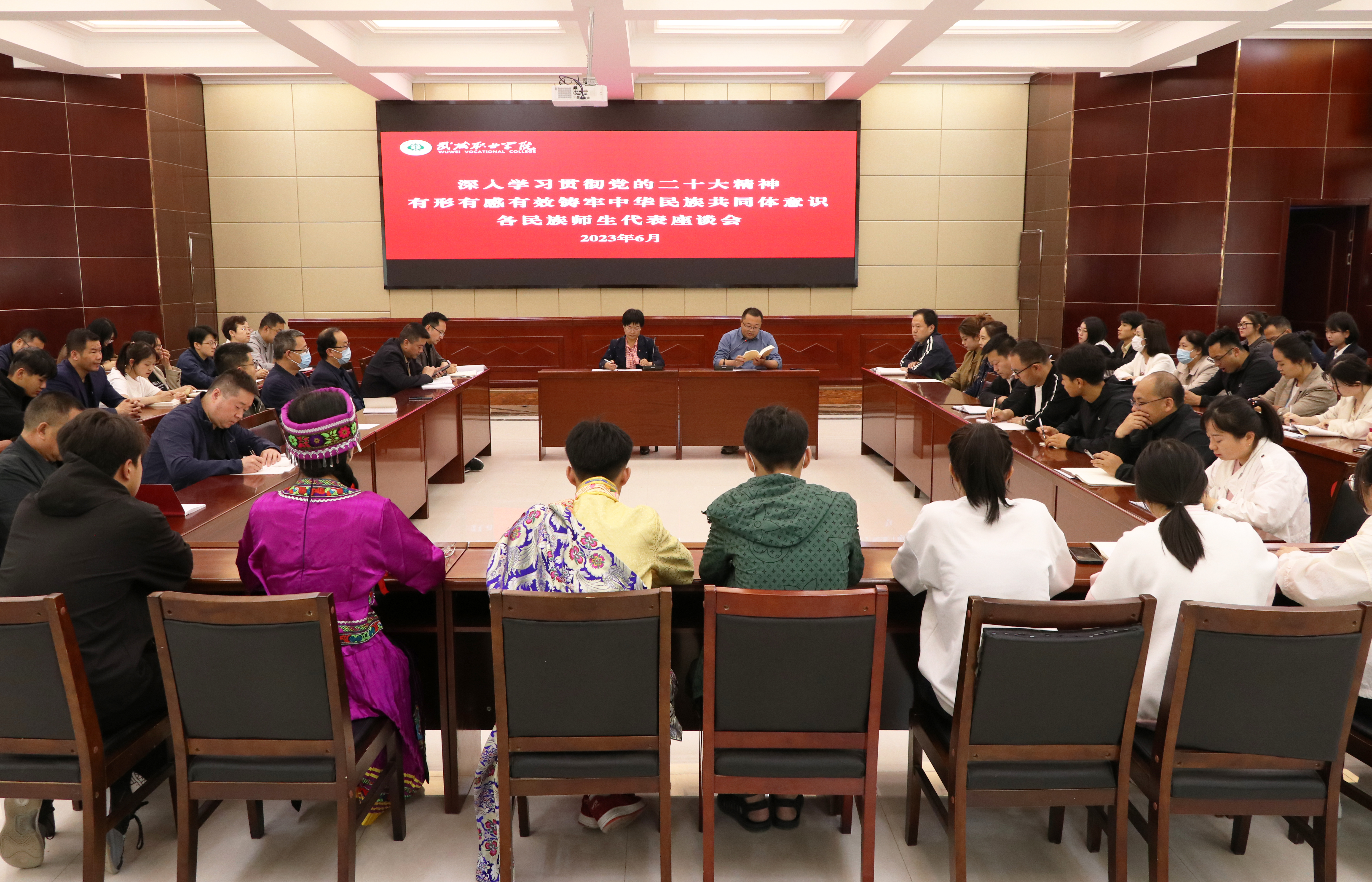 6月2日,學(xué)校召開以“學(xué)習(xí)貫徹黨的二十大精神? 有形有感有效鑄牢中華民族共同體意識(shí)”為主題的各民族師生代表座談會(huì),學(xué)校漢族、藏族、回族、土族、滿族、苗族等13個(gè)民族師生代表60多人參加了座談會(huì)。學(xué)校黨委委員、副校長何毅出席會(huì)議并講話,座談會(huì)由宣傳統(tǒng)戰(zhàn)部負(fù)責(zé)人魏全民主持。