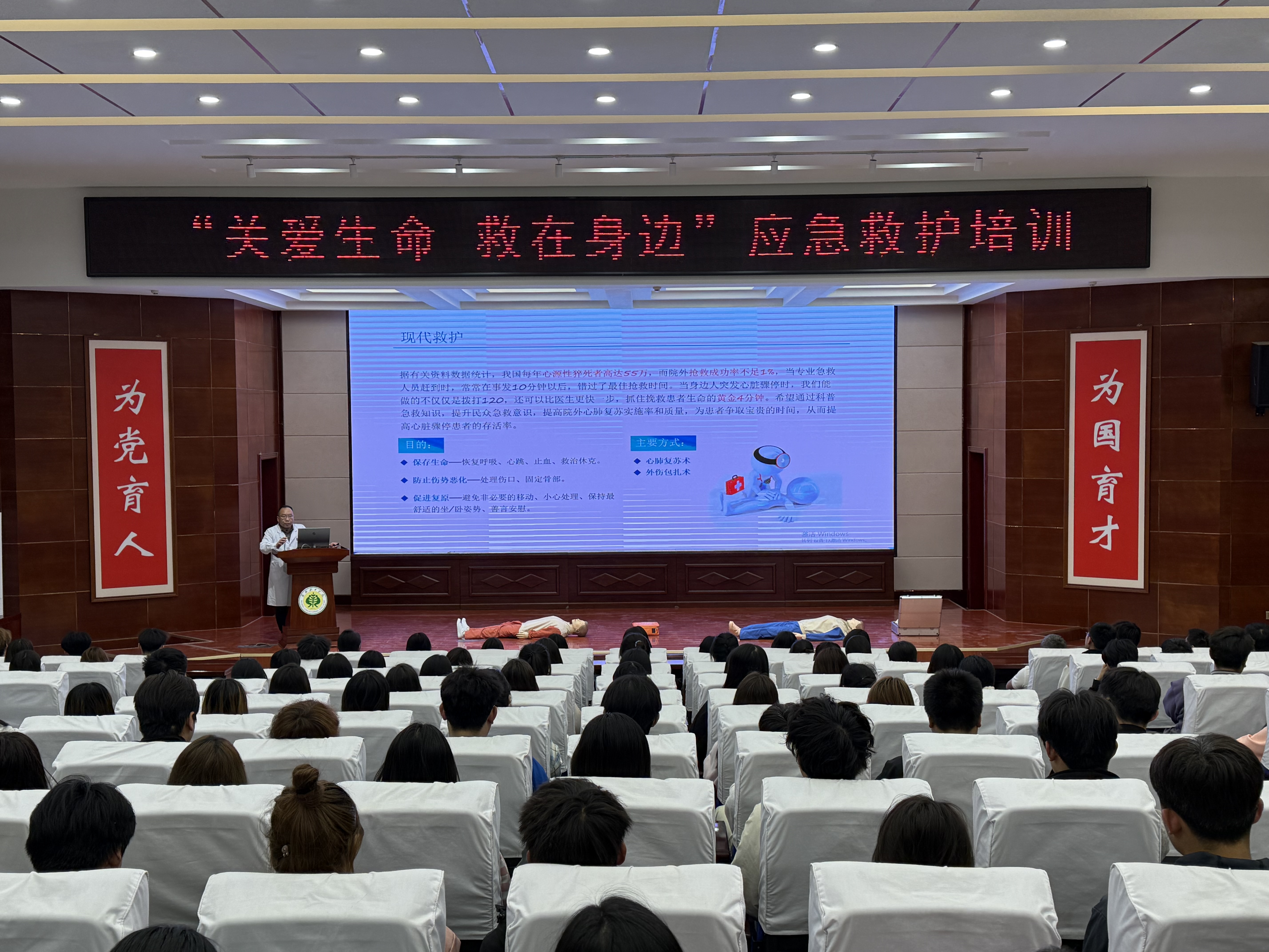 在理論環(huán)節(jié),武威市人民醫(yī)院急診科劉主任圍繞現(xiàn)代救護(hù)理念展開(kāi)講解,重點(diǎn)強(qiáng)調(diào)“黃金4分鐘”在心肺復(fù)蘇中的關(guān)鍵作用,并詳細(xì)解讀心肺復(fù)蘇(CPR)操作流程、AED使用規(guī)范、海姆立克急救法及創(chuàng)傷救護(hù)技術(shù)。結(jié)合真實(shí)案例,劉主任糾正了“掐人中急救”“盲目搬動(dòng)傷者”等常見(jiàn)誤區(qū),通過(guò)視頻演示和互動(dòng)問(wèn)答,幫助同學(xué)們掌握科學(xué)施救要點(diǎn)?!凹本仁敲總€(gè)公民的社會(huì)責(zé)任,關(guān)鍵時(shí)刻能挽救生命?!眲⒅魅蔚闹v解深入淺出,現(xiàn)場(chǎng)學(xué)生認(rèn)真記錄,積極提問(wèn)。?