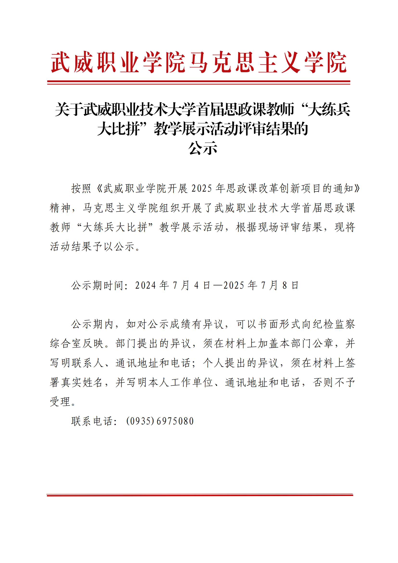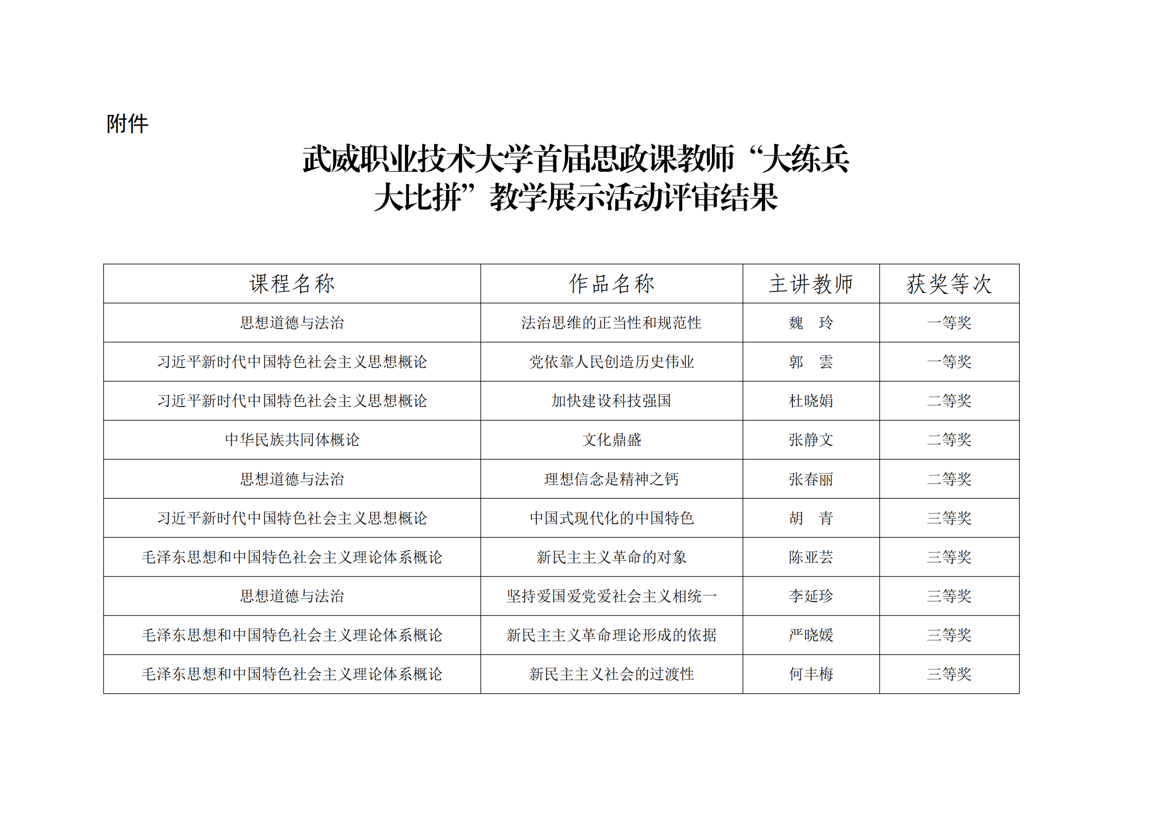 武威職業(yè)技術(shù)大學首屆思政課教師“大練兵大比拼”教學展示活動評審結(jié)果的公示