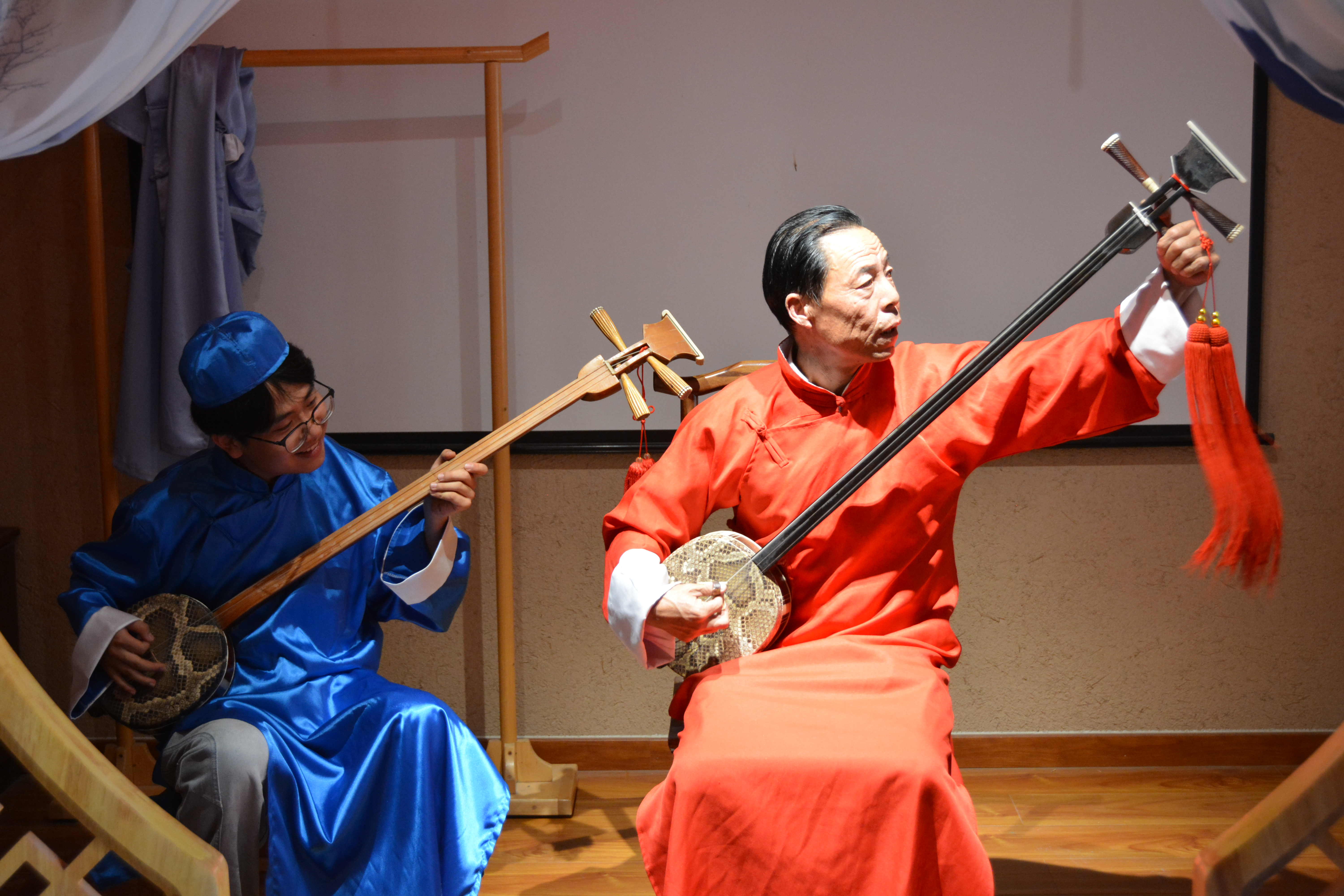 非遺民俗文化館當(dāng)天化身成為一座流動的非遺課堂,實踐團成員們圍坐在古樸的庭院中,聚精會神地聆聽當(dāng)?shù)刭Y深賢孝藝人董永虎老師深情演繹的經(jīng)典曲目。老藝人蒼勁而富有穿透力的嗓音,伴著三弦琴弦的顫動,將一段段蘊含忠孝節(jié)義、勸人向善的古老故事娓娓道來。那飽經(jīng)歲月洗禮的曲調(diào),仿佛穿越時空,在青磚黛瓦間回蕩,讓在場的每一位學(xué)子都深深沉浸其中,體味著這門古老說唱藝術(shù)所承載的歷史重量與人文溫度。