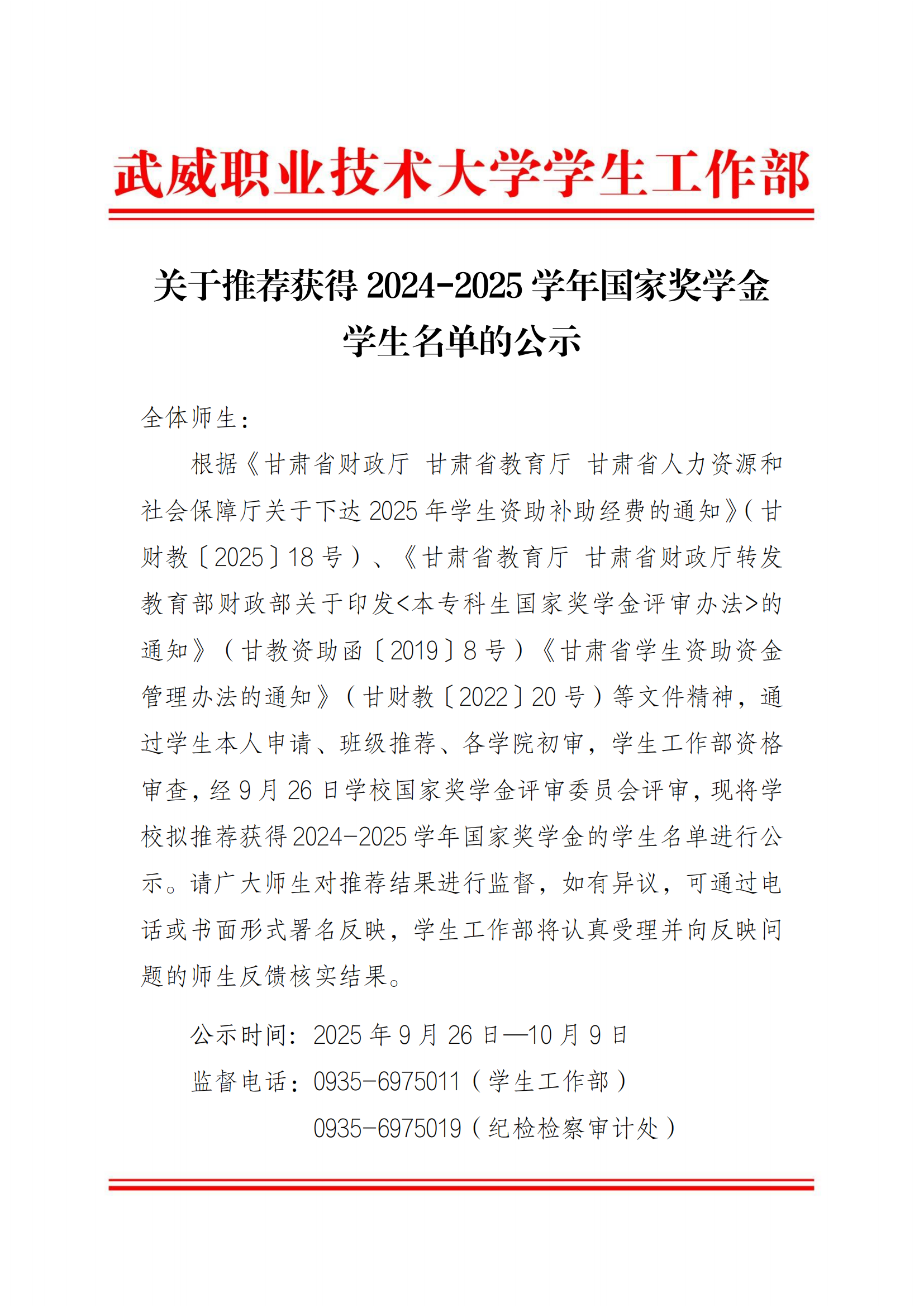 甘肅省武威師范學校關(guān)于2024-2025學年中職國家獎學金候選人的公示