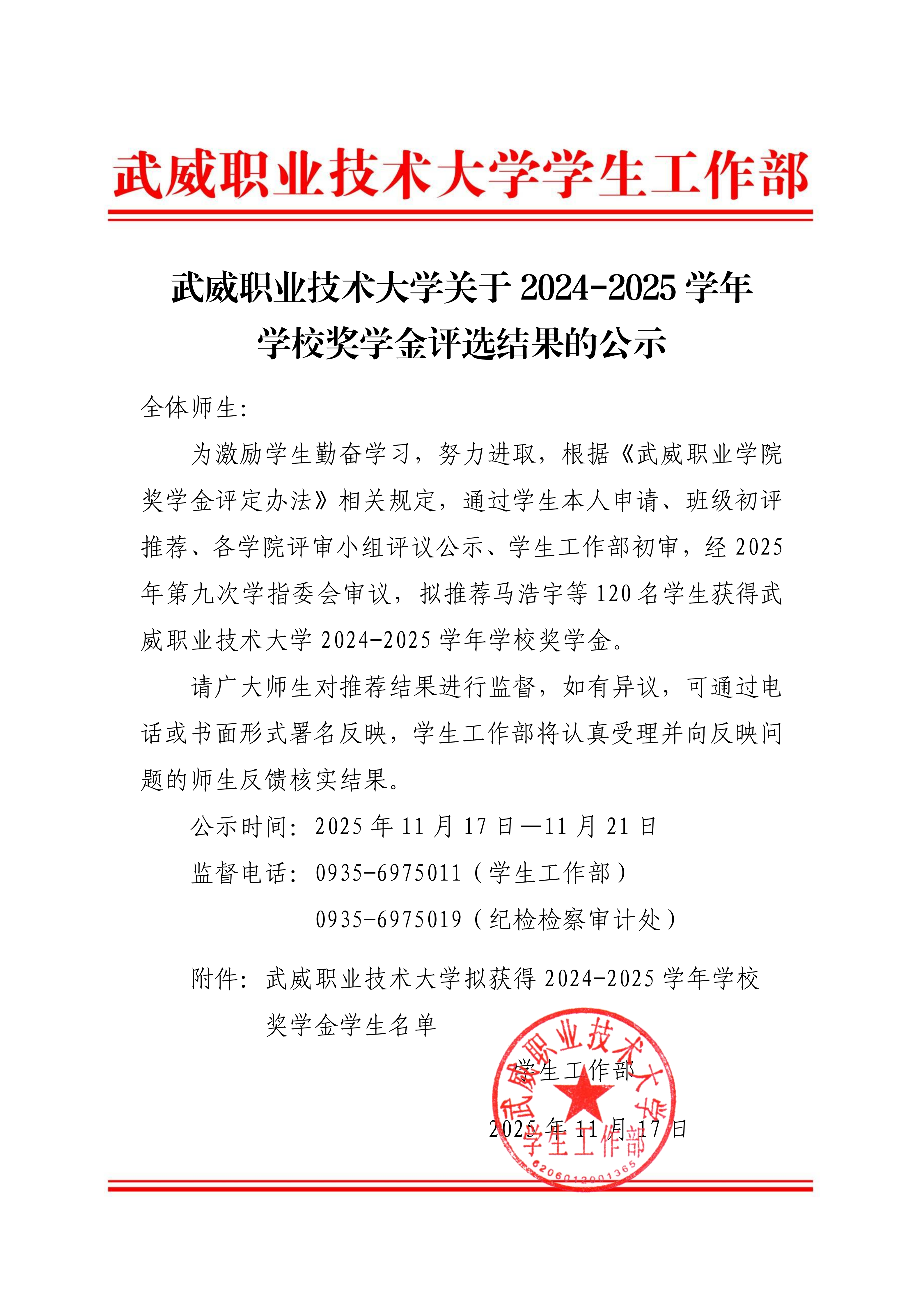 武威職業(yè)技術(shù)大學(xué)關(guān)于2024-2025學(xué)年學(xué)校獎(jiǎng)學(xué)金評(píng)選結(jié)果的公示
