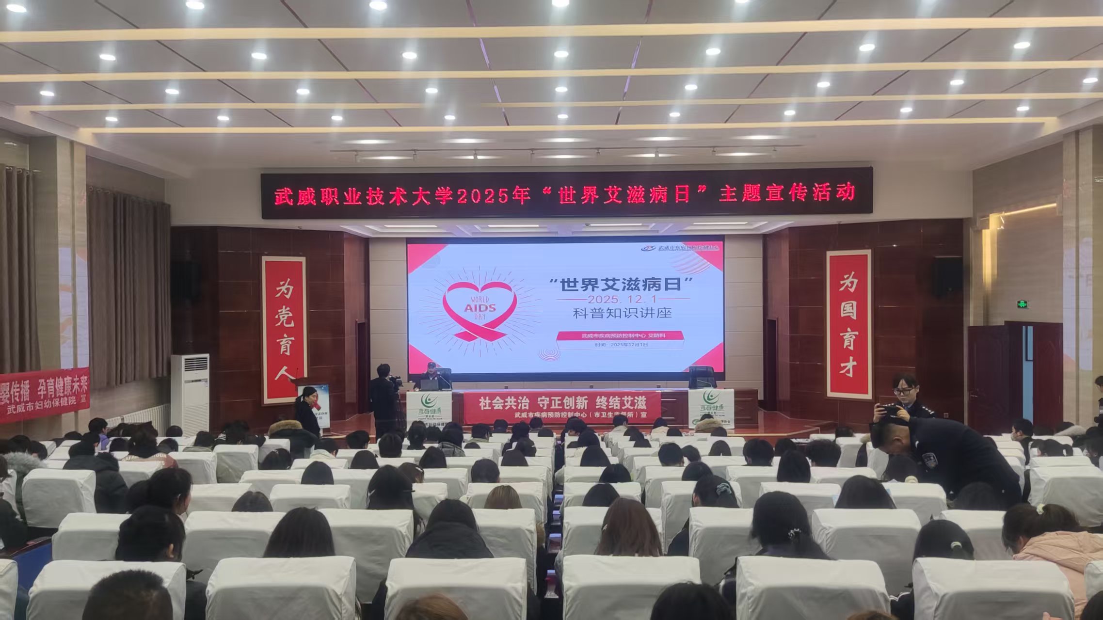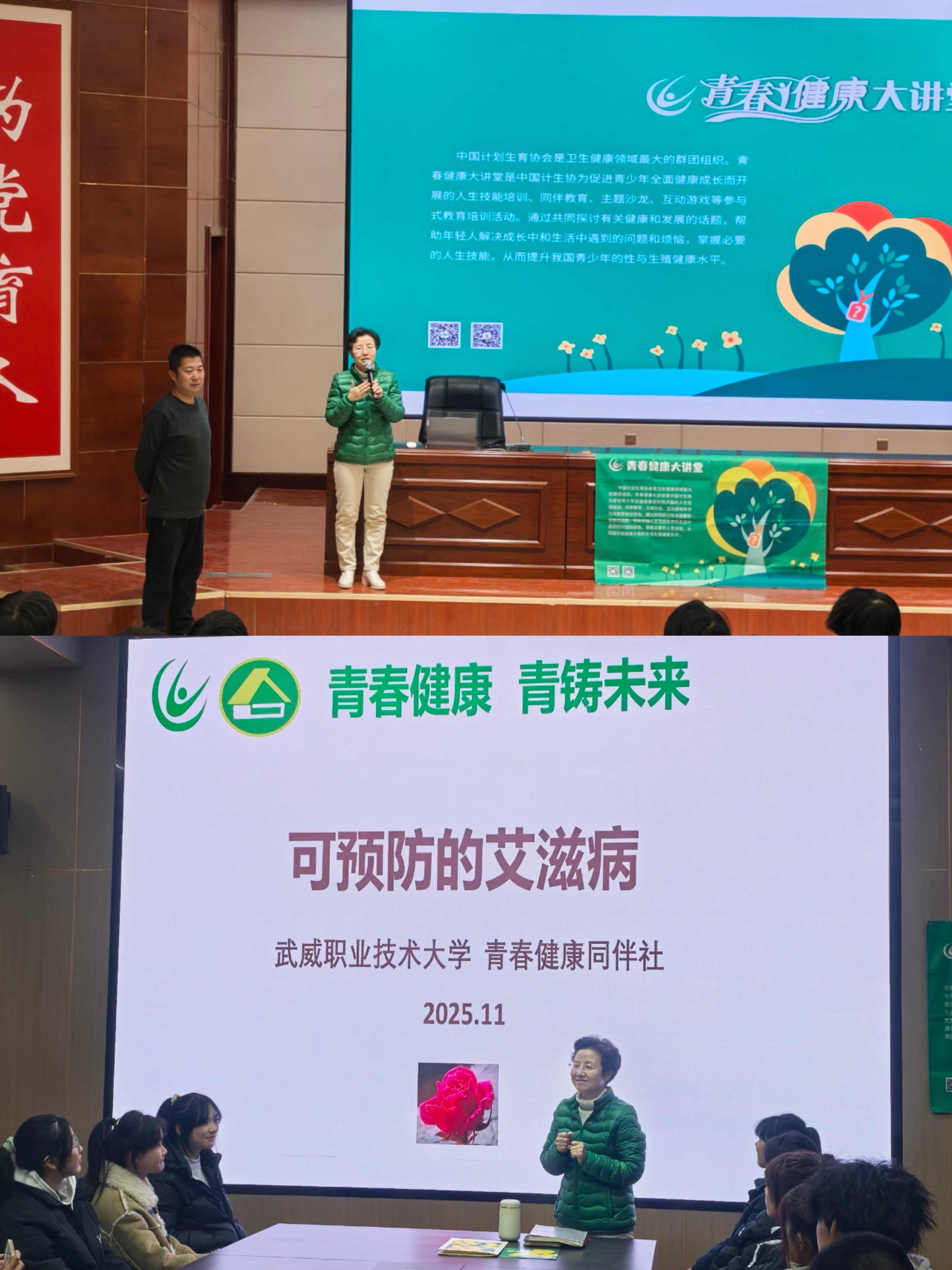 當天的主題宣傳活動內(nèi)容豐富,形式多樣?;顒右潦?,“知艾防艾”專題講座在菁英廳率先開講。講座特邀武威市疾病預防控制中心艾防科負責人王向尚與武威市人民醫(yī)院的皮膚科副主任醫(yī)師李杉擔任主講嘉賓。專家們結(jié)合一線工作實際經(jīng)驗,用翔實的數(shù)據(jù)和鮮活的案例,生動講解了艾滋病的傳播途徑、預防措施、流行現(xiàn)狀以及反歧視理念,內(nèi)容深入淺出,貼近學生實際,有效幫助大家樹立起正確的防艾觀念,消除對艾滋病感染者的誤解與恐懼。
