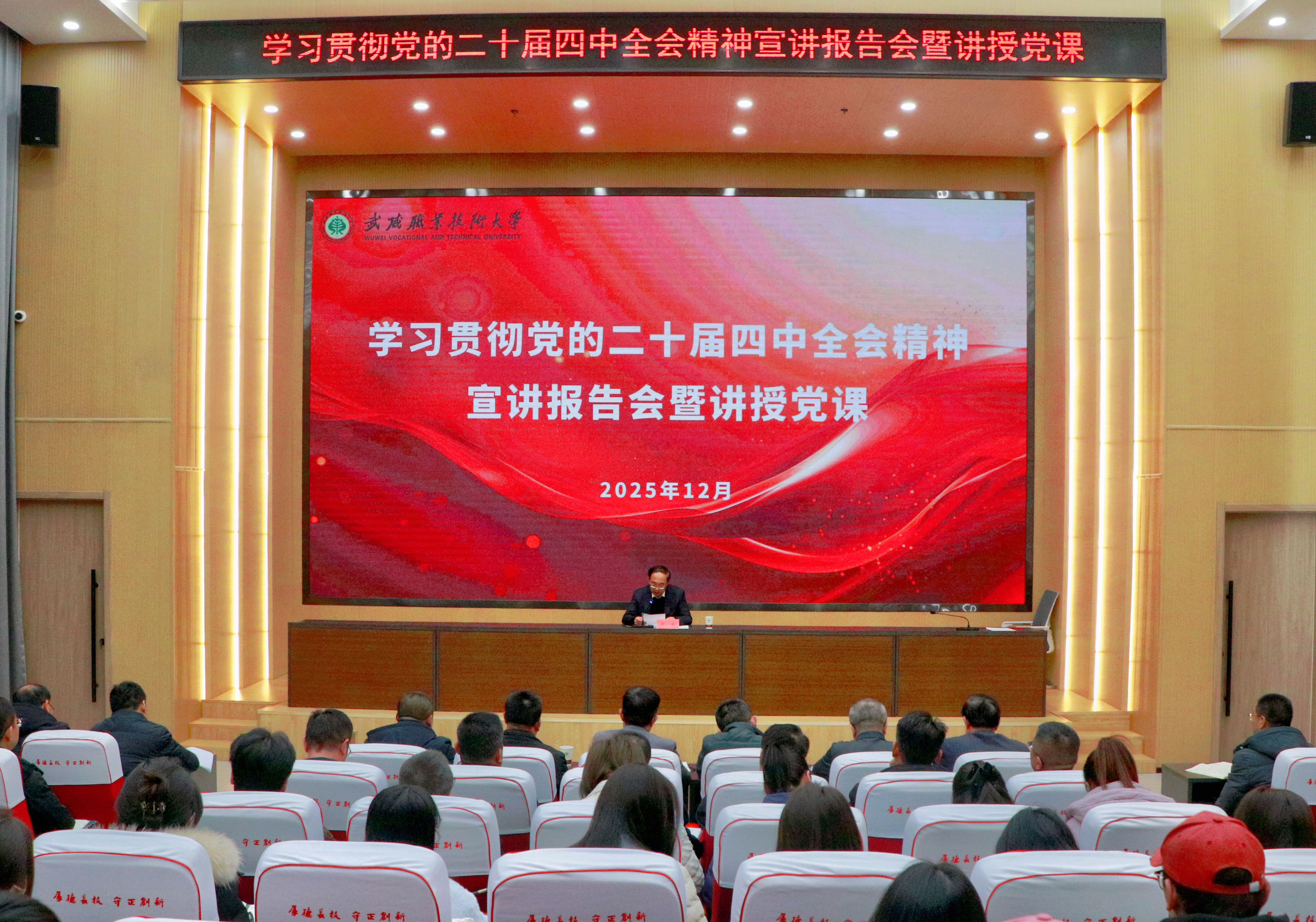 12月10日,黨委書記王宏專題宣講黨的二十屆四中全會精神,并向師生講授黨課。他強調(diào),要深入學(xué)習(xí)貫徹黨的二十屆四中全會精神,全面把握核心要義,立足職業(yè)本科教育新起點奮力譜寫學(xué)校高質(zhì)量發(fā)展新篇章,為加快推進中國式現(xiàn)代化武威實踐貢獻智慧力量。黨委副書記、副校長張開禮主持報告會。