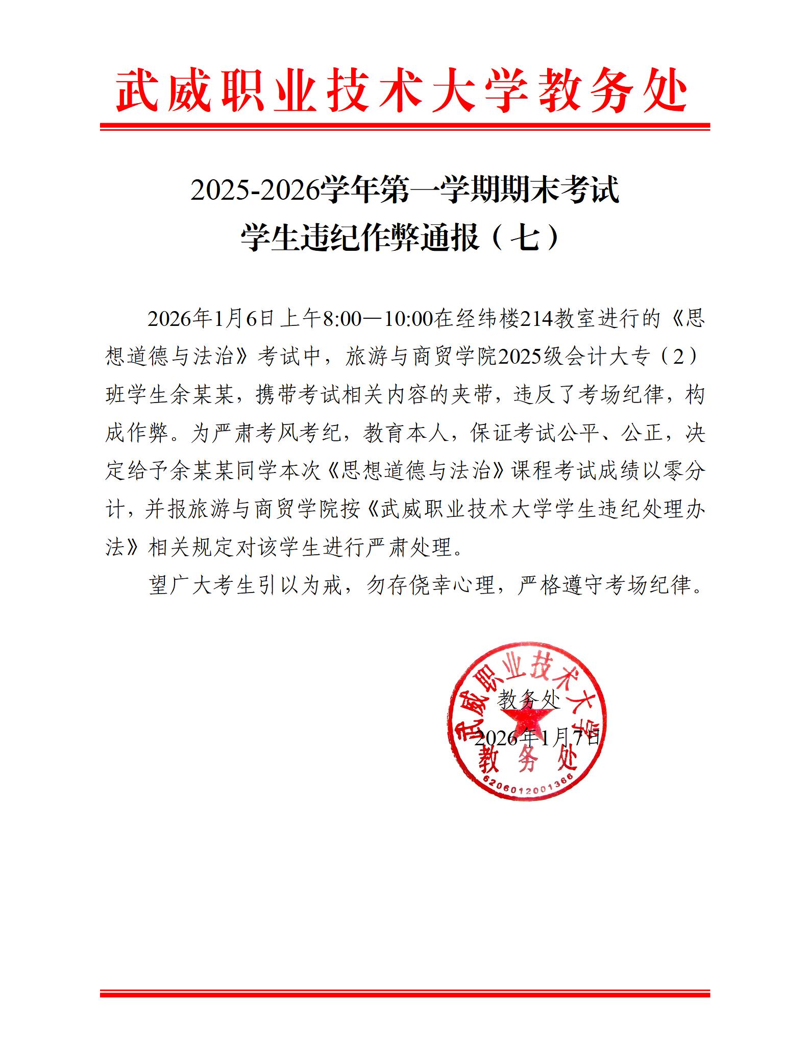 2025-2026學(xué)年第一學(xué)期期末考試學(xué)生違紀(jì)作弊通報(bào)(七)
