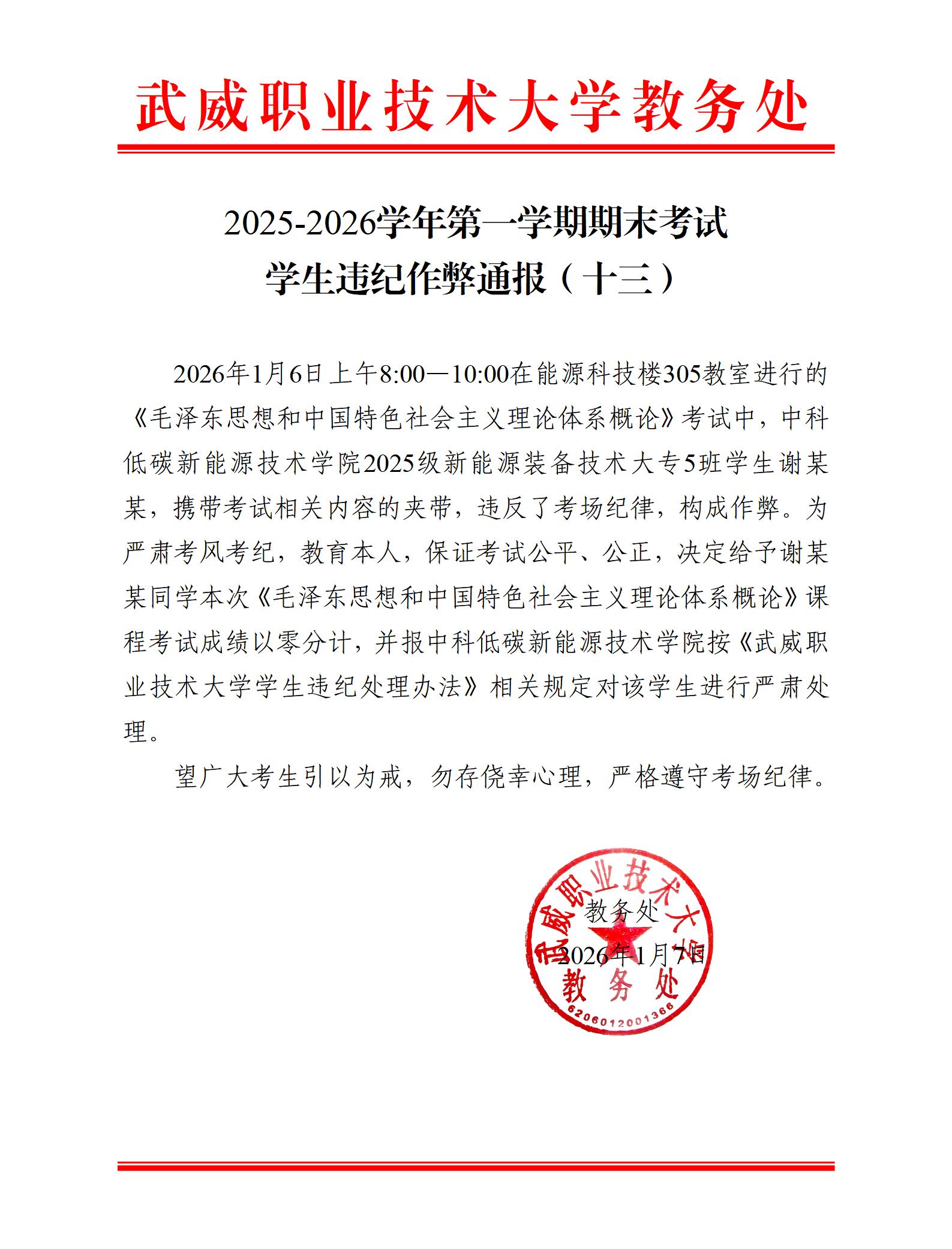 2025-2026學(xué)年第一學(xué)期期末考試學(xué)生違紀(jì)作弊通報(bào)(十三)