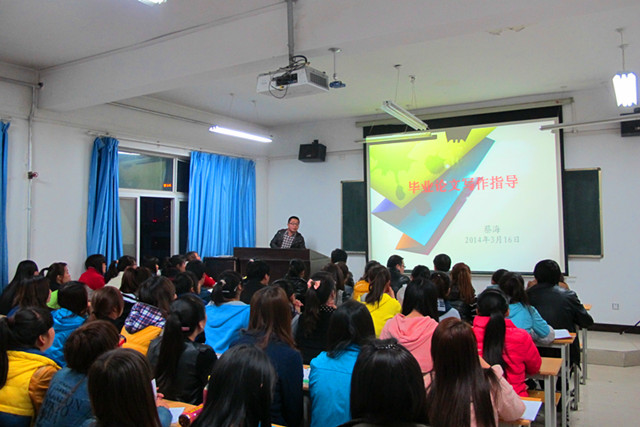 系主任晏素珍對本次畢業(yè)生畢業(yè)論文(設(shè)計(jì))做了三點(diǎn)要求,一是全體畢業(yè)生要高度重視畢業(yè)論文(設(shè)計(jì))的寫作;二是嚴(yán)格按照指導(dǎo)教師的要求保質(zhì)保量的完成論文;三是每位指導(dǎo)老師對論文指導(dǎo)工作要認(rèn)真負(fù)責(zé)、耐心細(xì)致。蔡海老師做了題為《畢業(yè)生論文寫作指導(dǎo)》的報(bào)告,主要從論文格式要求、文獻(xiàn)查詢方法、論文寫作方法三個方面給同學(xué)們做了深入淺出的講解,受到同學(xué)們的熱烈歡迎。