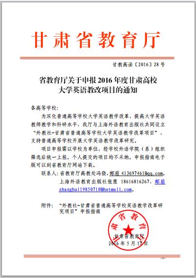 省教育廳關(guān)于申報2016年度甘肅高校大學(xué)英語教改項(xiàng)目的通知