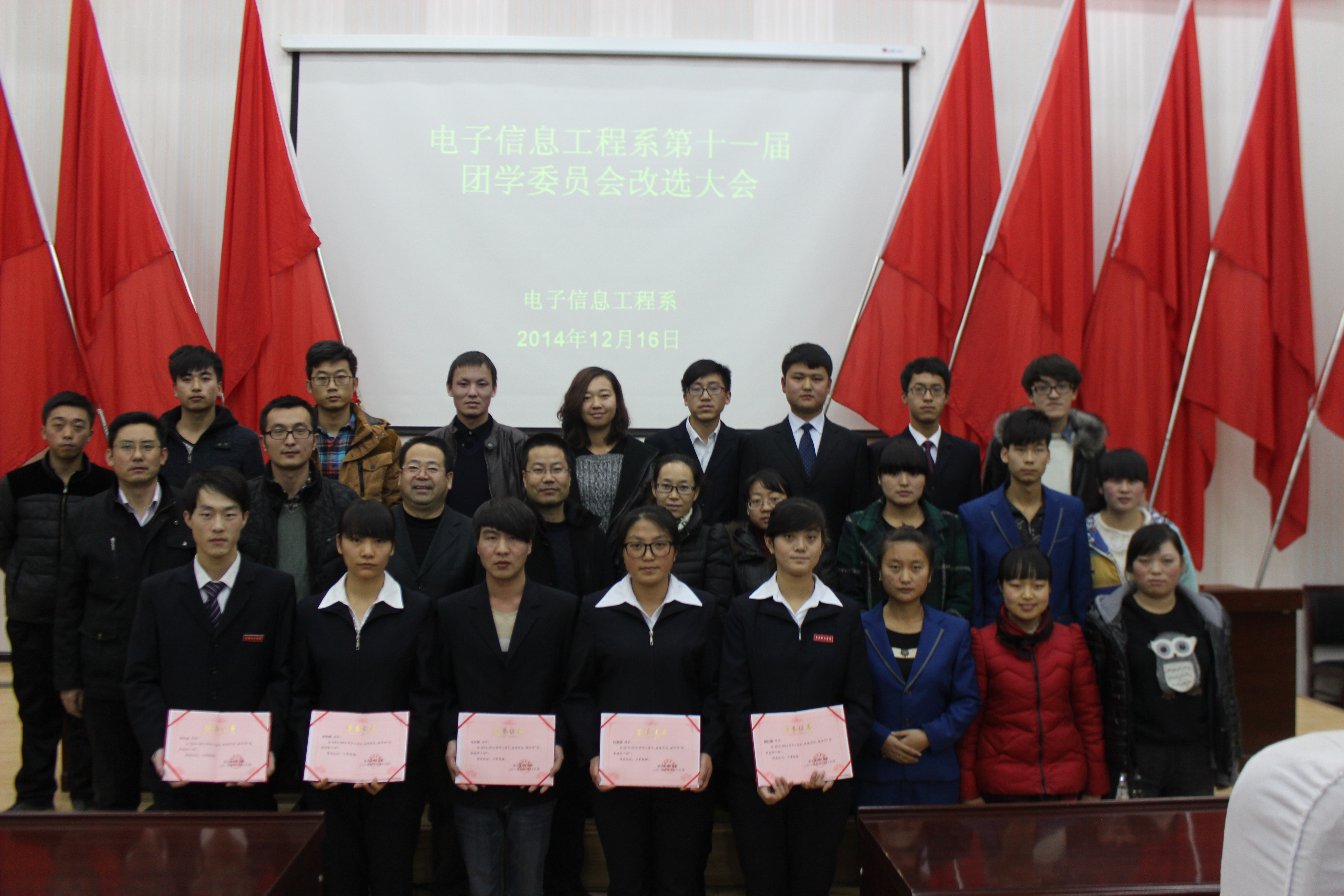 系主任白玉珍對我系團學(xué)工作給予了高度的評價,對上一屆團總支學(xué)生會優(yōu)秀學(xué)生干部進(jìn)行了表彰并頒發(fā)了榮譽證書。最后系書記張伯成致閉幕詞,認(rèn)為我系團學(xué)工作緊密圍繞學(xué)風(fēng)建設(shè)這一中心,著力推進(jìn)對學(xué)生的各項服務(wù),開展了一系列富有特色的活動,取得了良好的成效。他還對我系的團學(xué)工作提出了新的要求,希望新一屆團學(xué)干部做到加強政治理論學(xué)習(xí),做好模范帶頭作用,克服困難,團結(jié)一致,服務(wù)好全系學(xué)生,為實現(xiàn)電子信息工程系學(xué)生工作新的跨越努力。
