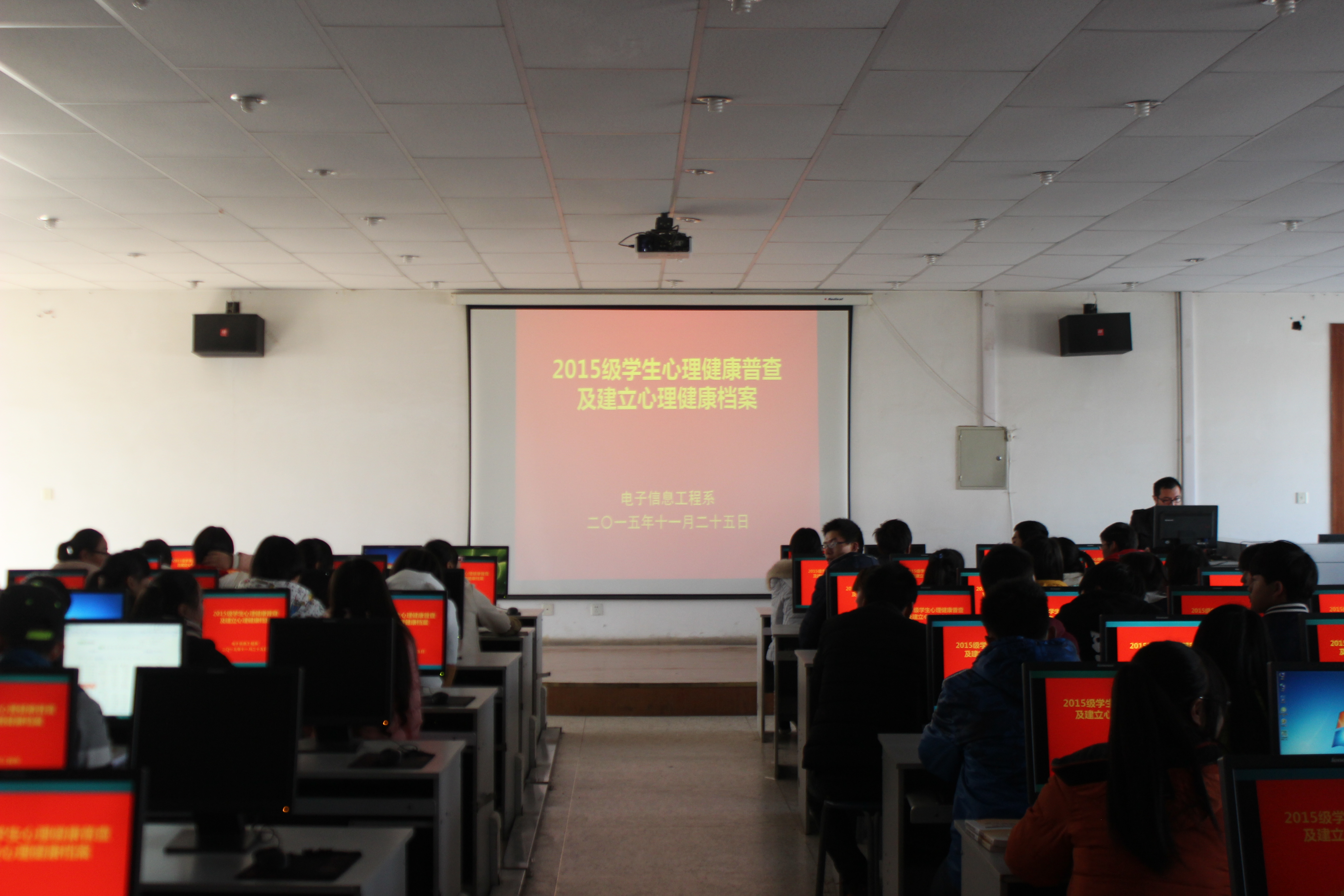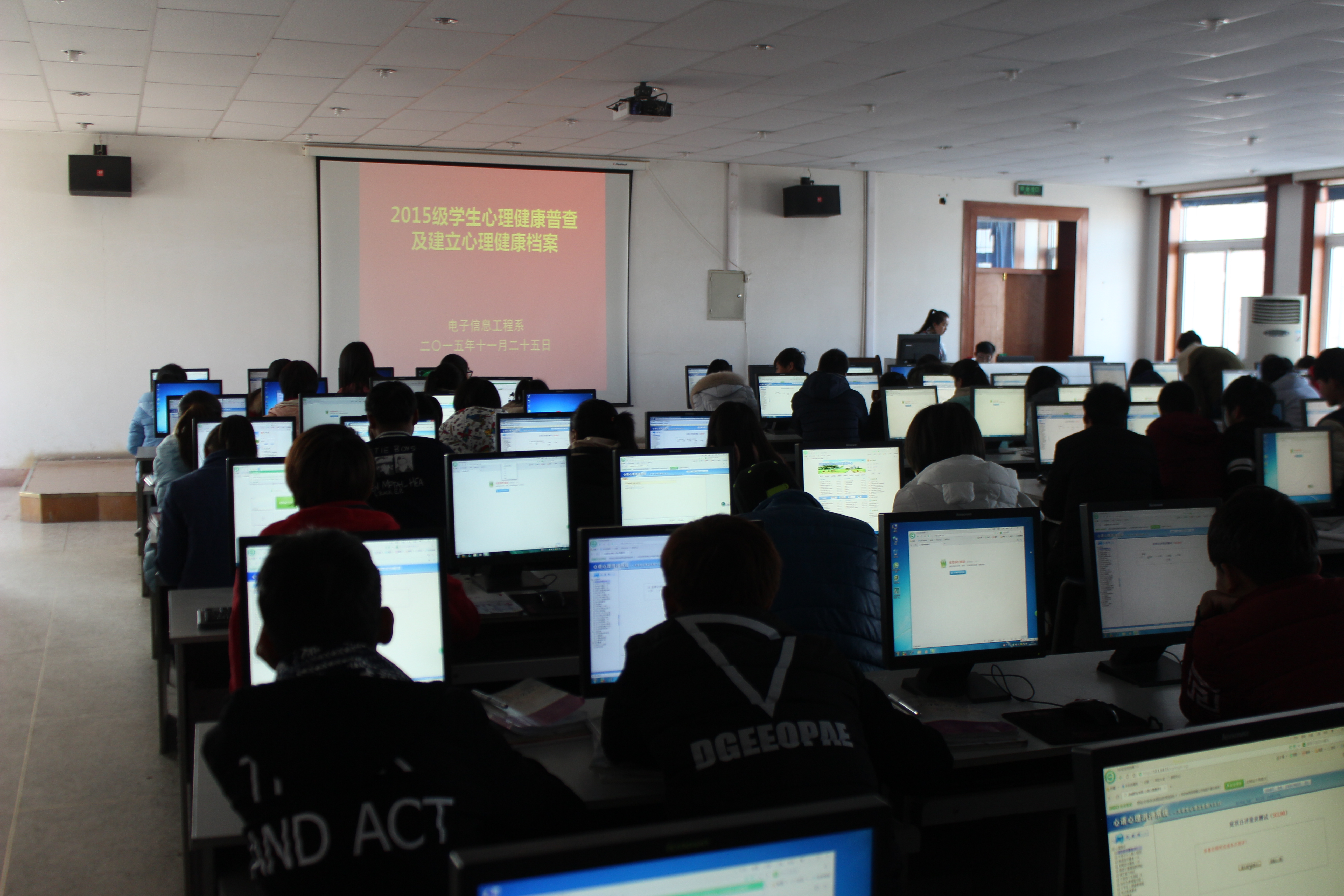 為及時掌握2015級學生的心理健康狀況,有針對性地進行心理健康教育,按照學院心理健康普查安排及要求,11月25日12時10分,電子信息工程系組織2015級學生226人在尚德樓十號機房完成了心理健康狀況普測工作,并為每個同學建立了心理健康檔案。
