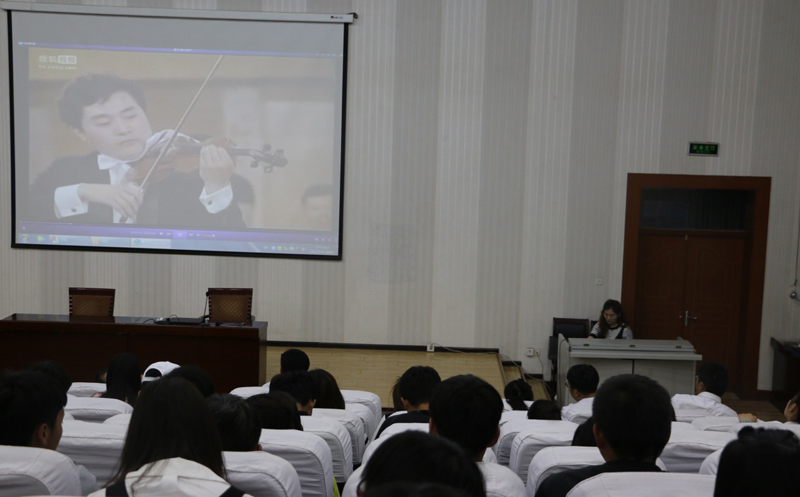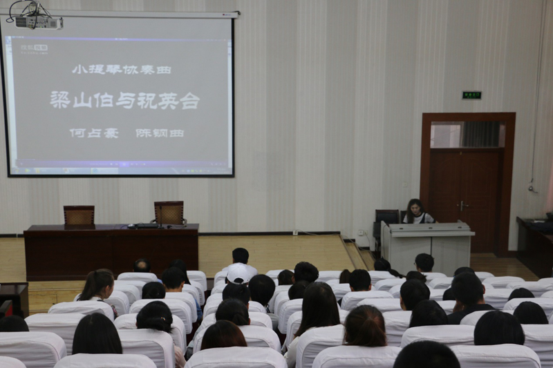 伴著優(yōu)美的音樂旋律王敏副教授開始了講座,王老師首先介紹了音樂發(fā)展歷史和音樂鑒賞的基礎(chǔ)知識,然后以我國著名作曲家陳鋼、何占豪先生創(chuàng)作的小提琴協(xié)奏曲《梁山伯與祝英臺》為題材,分階段講述了“鳥語花香”、“草橋結(jié)拜”、“英臺抗婚”、“投墳化蝶”等內(nèi)容和藝術(shù)場景。剖析了作品在管樂、和以小提琴、大提琴為主的弦樂及民樂有機結(jié)合的高超藝術(shù)境界,講座過程中王老師結(jié)合《梁祝》協(xié)奏曲音視頻資料,演繹了梁山伯與祝英臺凄美的愛情故事。