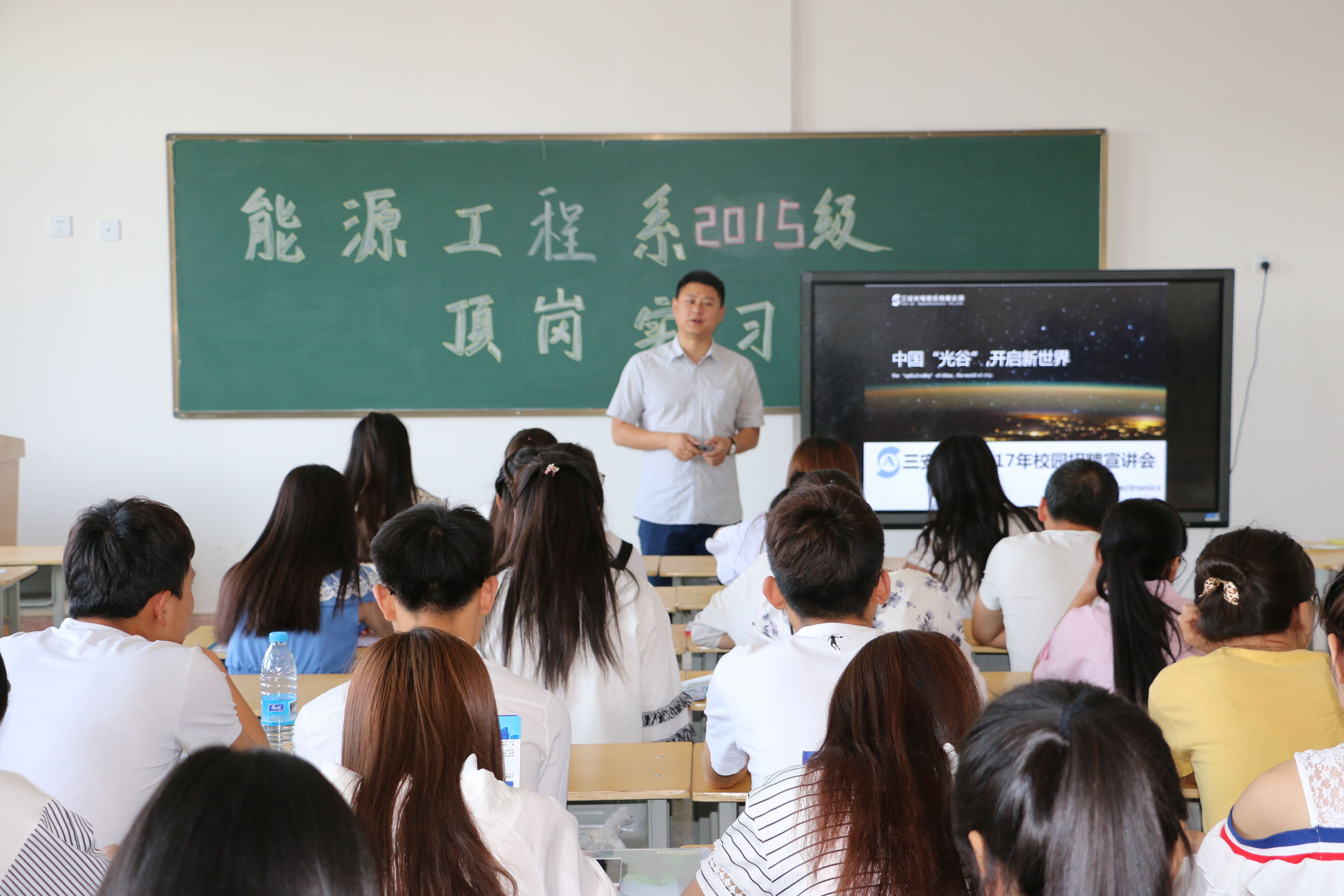 安徽三安光電有限公司在行樹樓504教室開展了頂崗實(shí)習(xí)宣講會(huì),2015級(jí)農(nóng)村能源與環(huán)境技術(shù)大專班和2015級(jí)太陽(yáng)能光熱技術(shù)及應(yīng)用大專班學(xué)生參加了此次宣講會(huì)。李明經(jīng)理就企業(yè)概況、企業(yè)文化、崗位需求、薪酬待遇等方面向同學(xué)們做了介紹,并對(duì)有應(yīng)聘意向的同學(xué)進(jìn)行了面試,最終共有50人被安徽三安光電有限公司錄用。