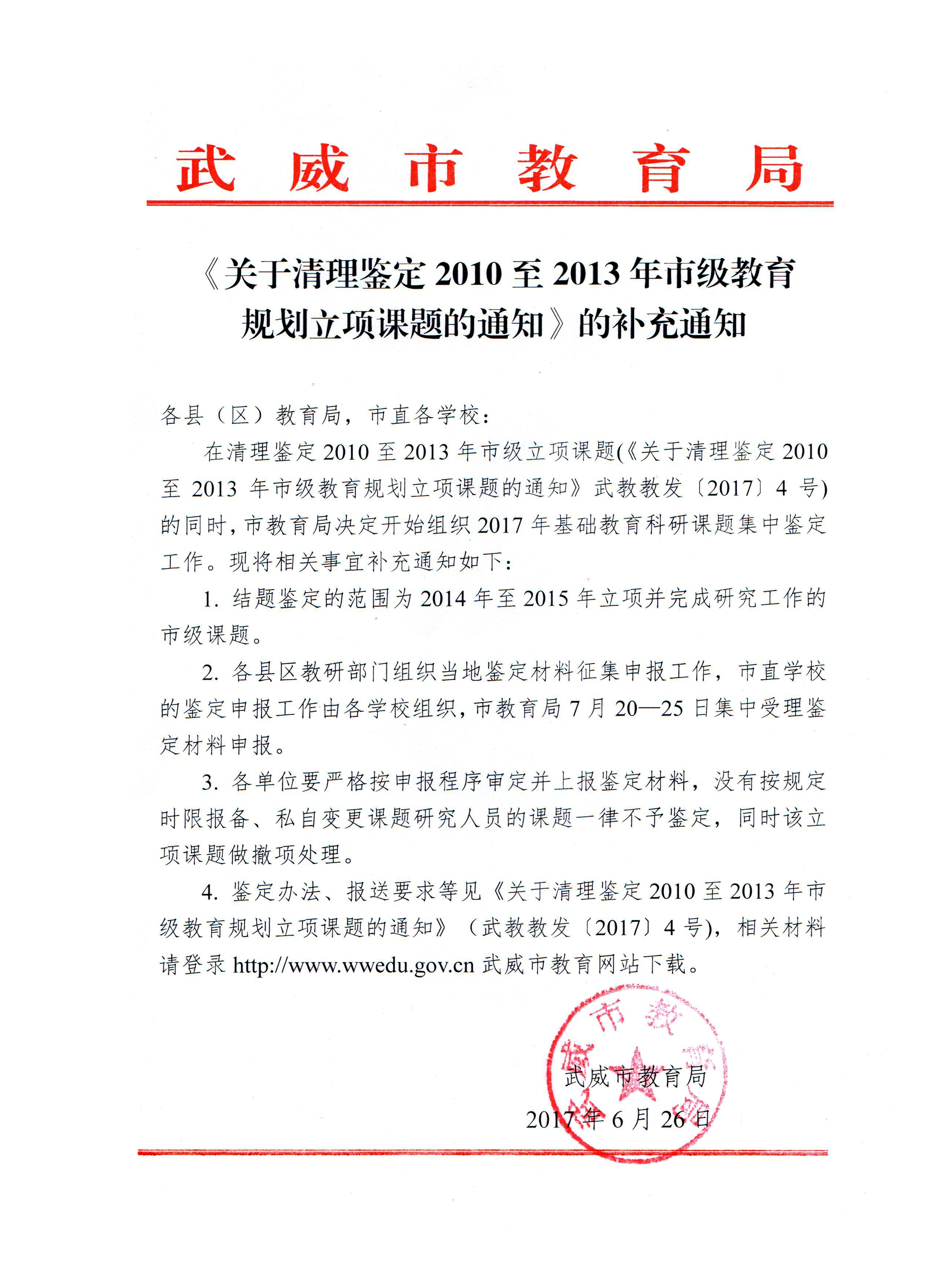 轉(zhuǎn)發(fā)武威市教育局《關(guān)于清理鑒定2010至2013年市級規(guī)劃立項(xiàng)課題的通知》的補(bǔ)充通知