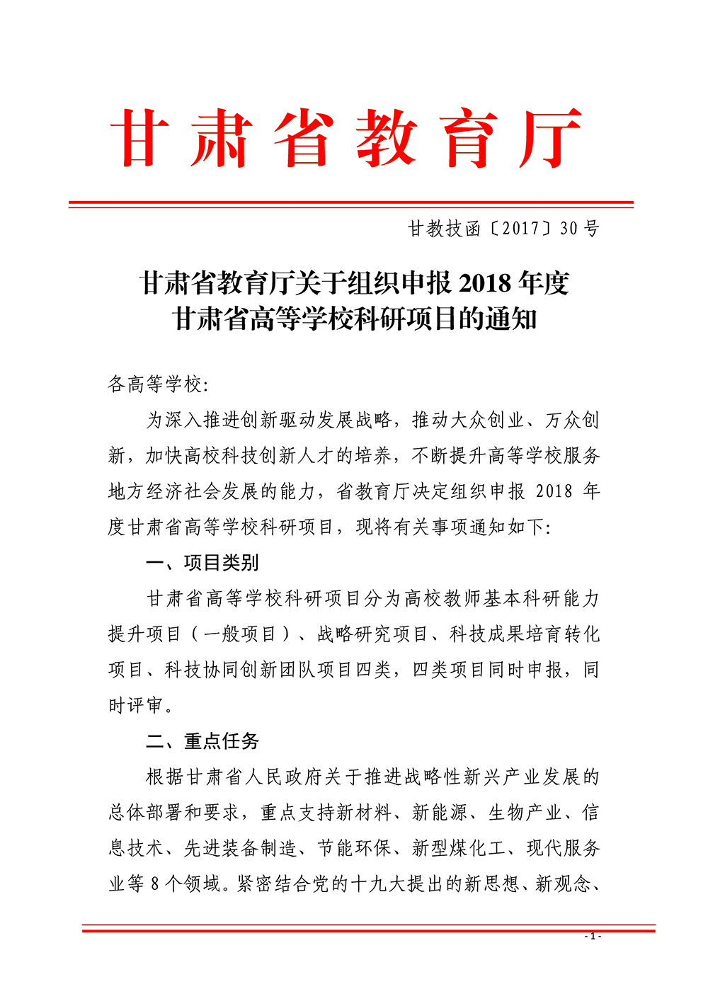 轉(zhuǎn)發(fā)甘肅省教育廳關(guān)于組織申報(bào)2018年度甘肅省高等學(xué)校科研項(xiàng)目的通知